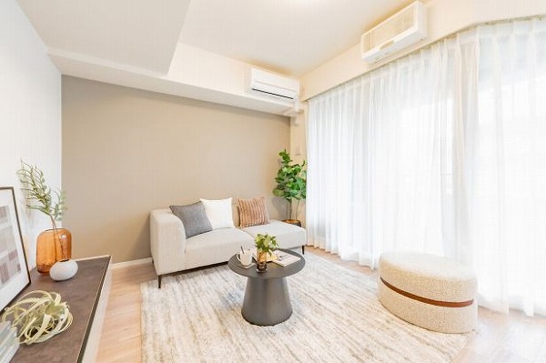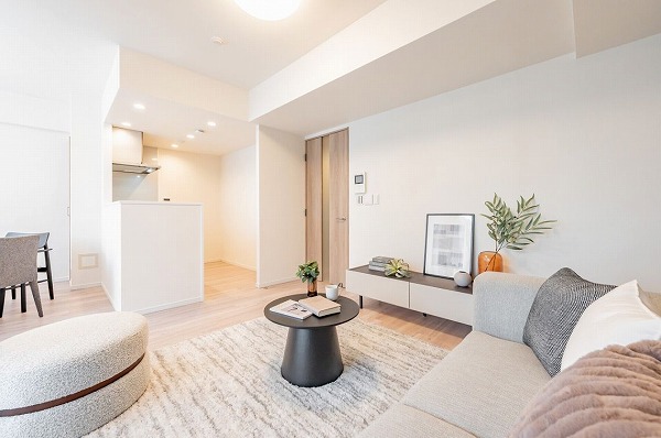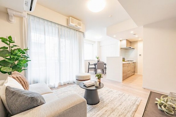 今回ご紹介したのは8階部分に位置する一室。専有面積62.54㎡の1SLDKは、パートナーとの暮らしにちょうど良いサイズ感。室内はリノベーションが施され、上質で洗練された住空間へと生まれ変わっています。約15.2帖のメインルームは、西向きの大きな窓から柔らかな陽光が差し込む明るい空間。リビングとダイニングを分けて配置しやすい形状で、家具レイアウトの自由度も高そうです。シンプルな内装デザインのため、様々なテイストのインテリアも楽しめますよ。