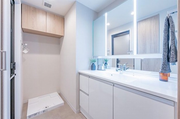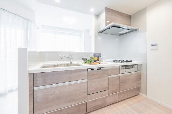 キッチンは対面式を採用し、調理中もリビングにいる家族との会話が楽しめます。ワークトップも広く設けられているため、下ごしらえや盛り付けもスムーズ。さらに食洗機を備え、後片付けの負担を軽減してくれるのも嬉しいポイント◎