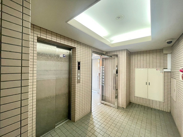 出入口は1階と2階の2ヵ所。1階から入るとメールボックスとエレベーター、2階入口には管理人室がありました。また、宅配ボックスも完備されています。