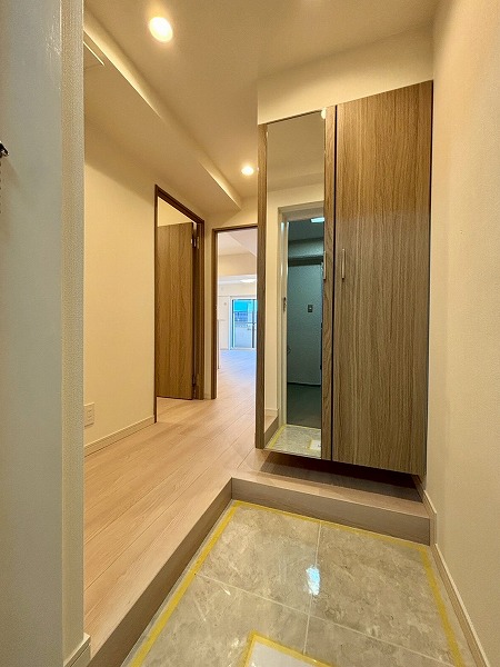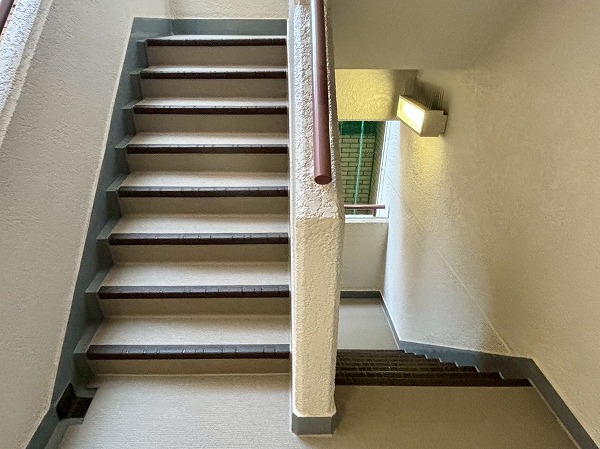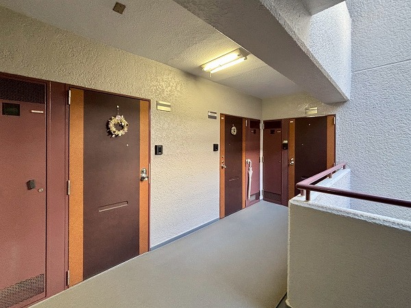 エレベーターや外階段を使って居住フロアへ向かいましょう。風通しの良い外廊下に玄関扉が並んでいます。しっかりと清掃されていて、管理体制の良さが伺えました♪