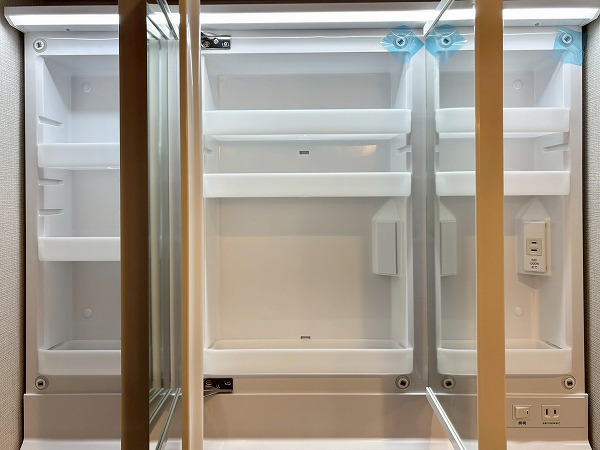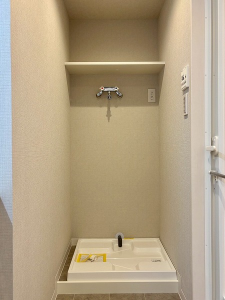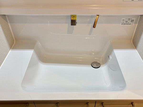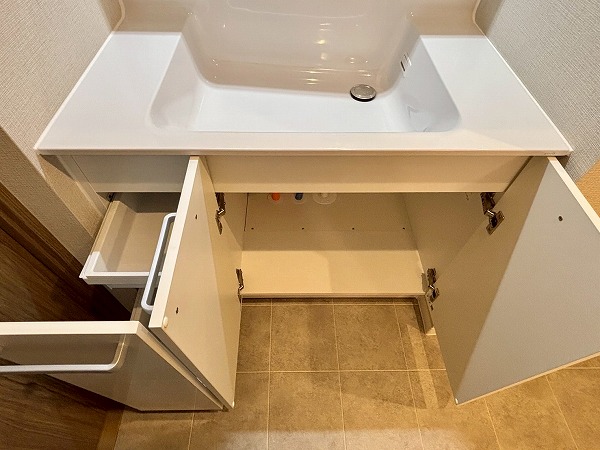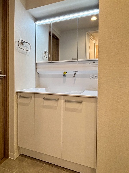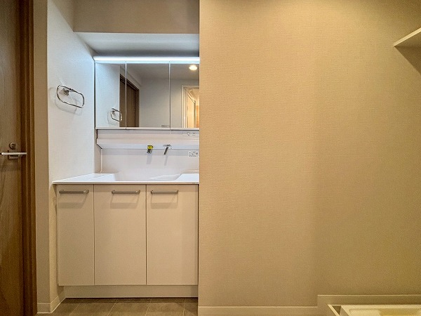 サニタリールームへはキッチン横のドアから行き来ができます。水回りが近くに配置されていることで、お料理と同時進行でお洗濯やお湯張りを行えます!家事動線の良い造りと言えますね。洗面化粧台は鏡の角度を変えられる3面鏡タイプ。収納豊富で使い勝手が良さそう。