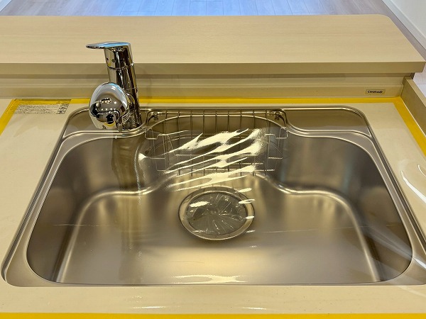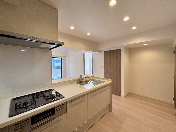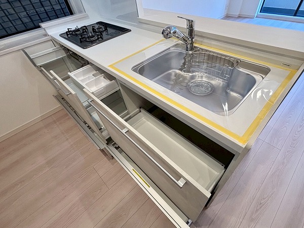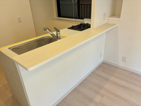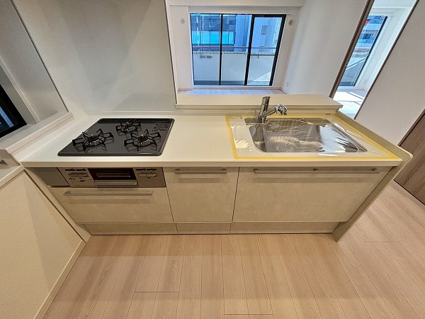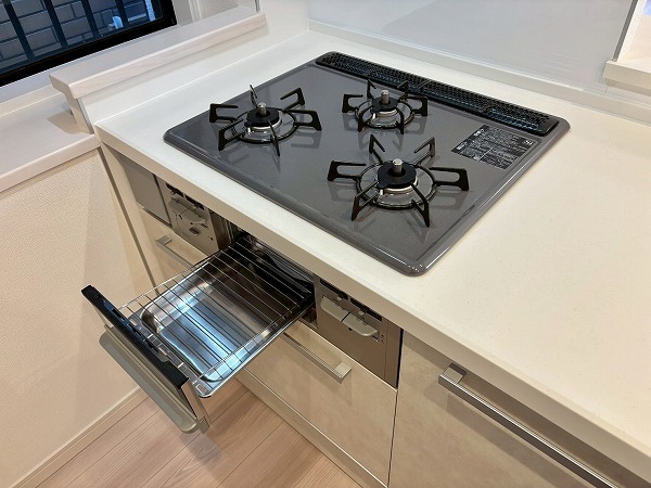 新規交換されたシステムキッチンは窓があり開放的です。幅が広く、背面に冷蔵庫やカップボードを設置することもできますよ。キッチンは幅が広くお皿洗いがしやすそう◎またガスコンロが3口と魚焼きグリルが搭載されています。一度に何品か作ることができ、調理時間の短縮に繋がります。