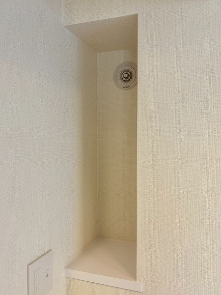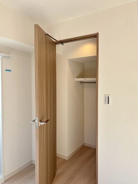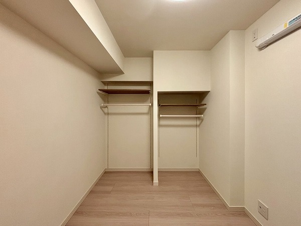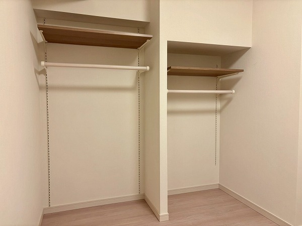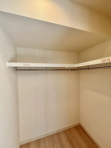 洋室にはまだまだ嬉しいポイントが。ドアを開けると…こちらのウォークインクローゼットが広がっていました!2面に枕棚とハンガーパイプがあり、お洋服をたくさんしまえます。扇風機や加湿器といった季節家電の保管場所にもピッタリ。