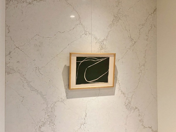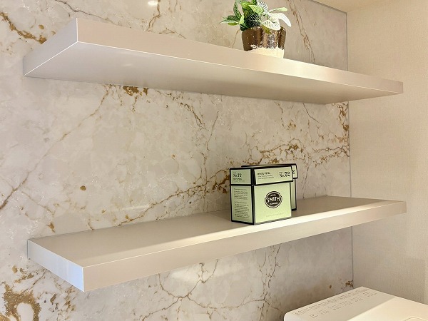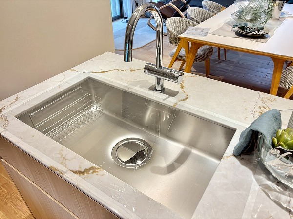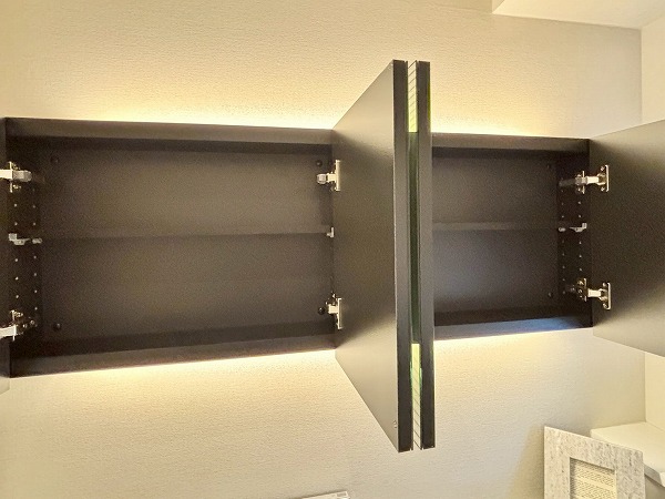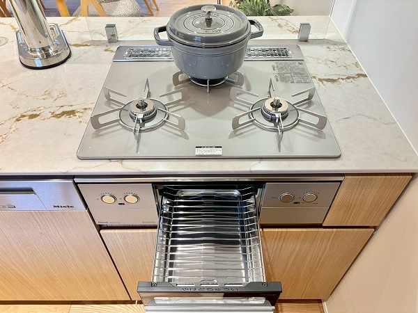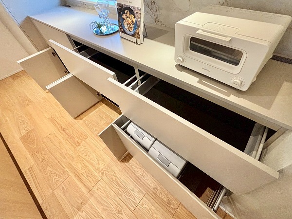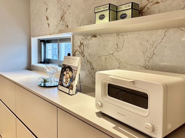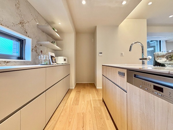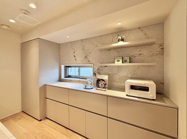 オーダー家具で知られる日本の家具ブランド、田中工藝製のシステムキッチンに新規交換されています。壁面とカウンターに同じ石調の素材が用いられ、統一感をもたらしていますね。カップボードにはゴミ箱を入れるスペースも設けられていました♪