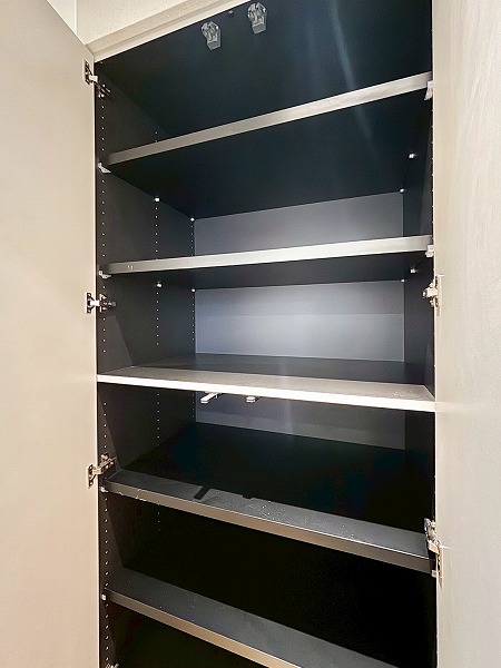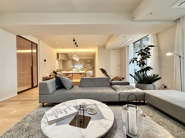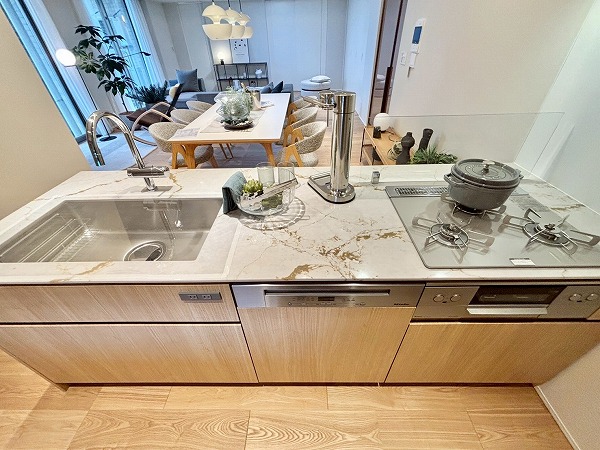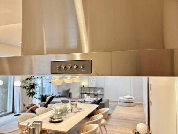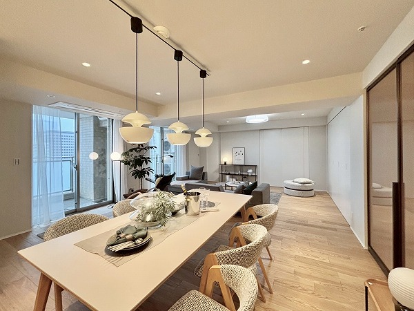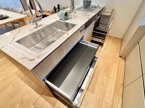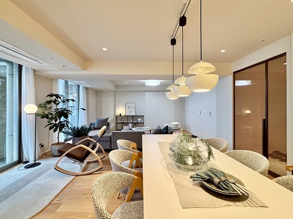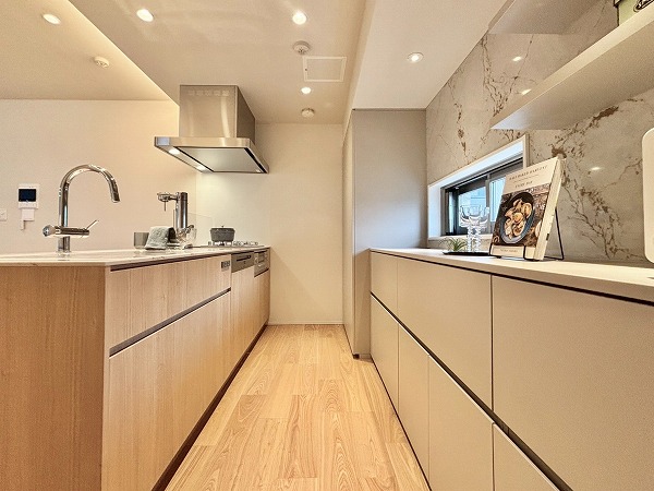 リビングダイニングキッチンは驚きのおよそ28.5帖。これならカウチソファや大家族用のダイニングテーブルも設置できますね。大きな収納が設けられているので、生活感のある日用品やお掃除道具などはそちらにしまってください。