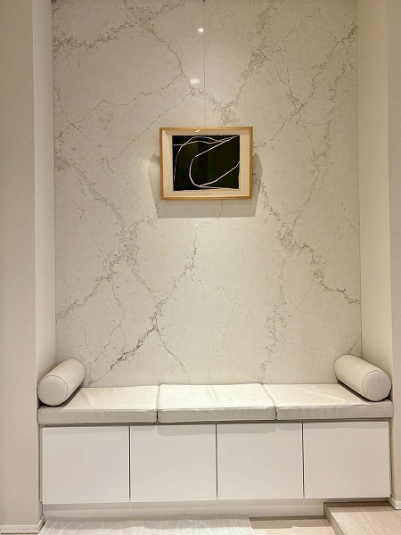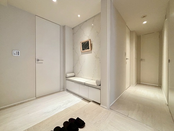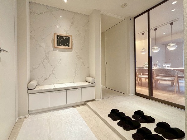 白を基調とした明るい玄関がお出迎え。まず目を惹くのは高級感のあるベンチです。ハイヒールや靴紐のある靴も、こちらに腰掛ければ落ち着いて履くことができますね。左手にるドアの先には、大きなシューズインクローゼットが。