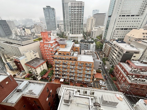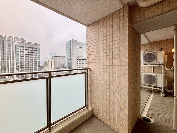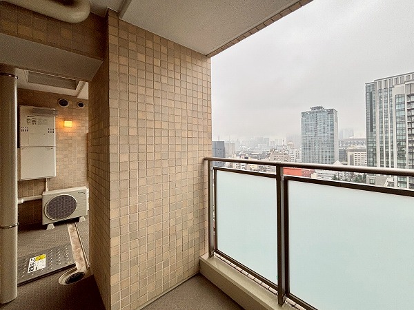 南向きのバルコニーからは都会的な街並みを一望できますよ。前面が開けているので、遠くの方まで見渡せました♪撮影時は残念ながら雨でしたが、晴れた日には明るい光が存分に感じられるはず。お洗濯物も良く乾きそうですね。