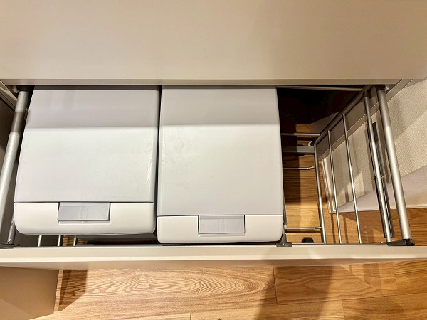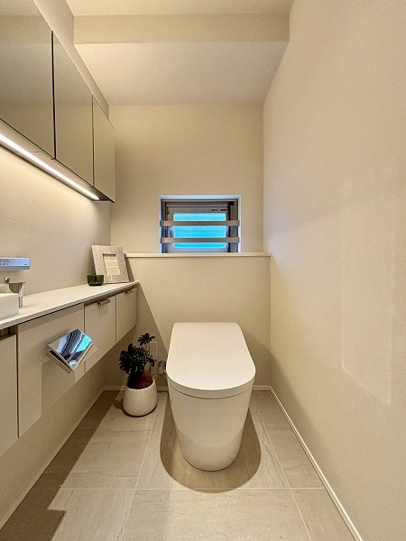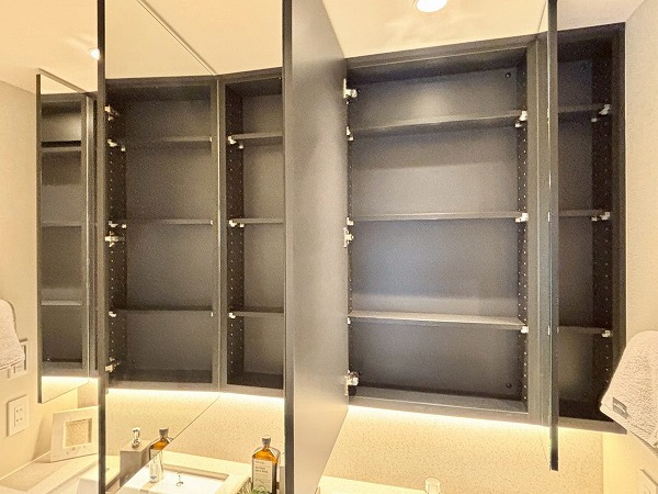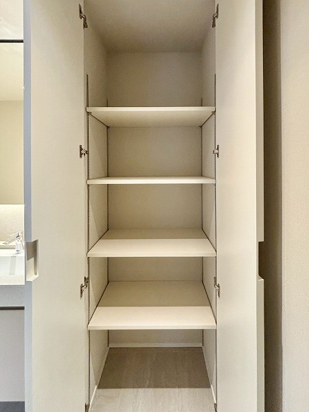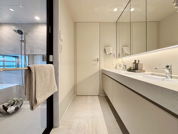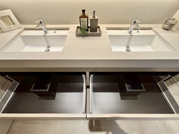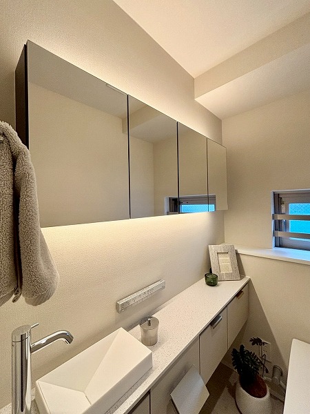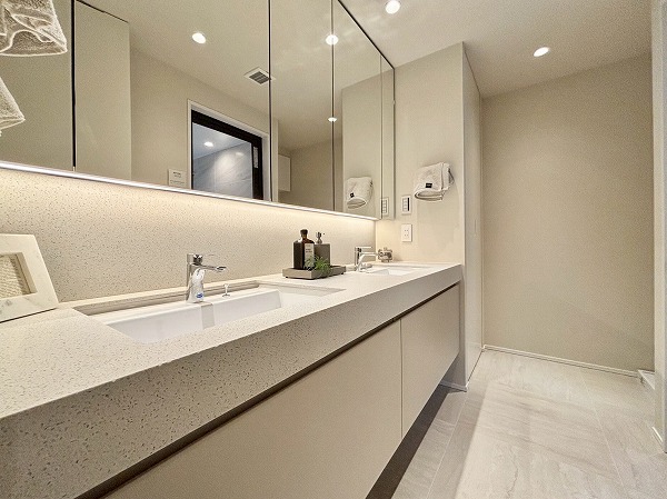 廊下の突き当りにサニタリールームがありました。キッチン同様田中工藝製の洗面化粧台が採用されています。2ボウルタイプなので、ご家族と並んでご利用いただけますよ。大きなリネン庫があり、さかばるバスタオルもすっきり収納可能。