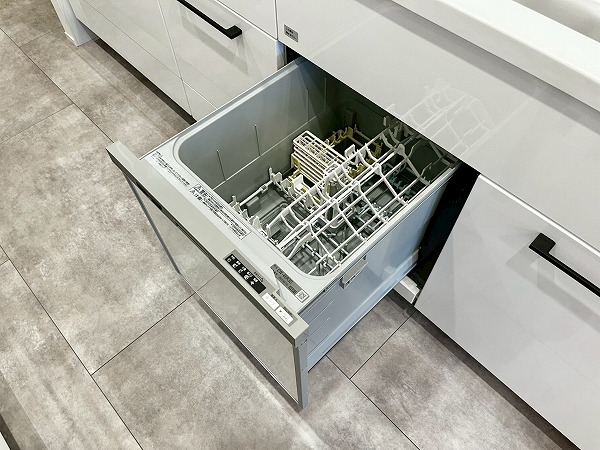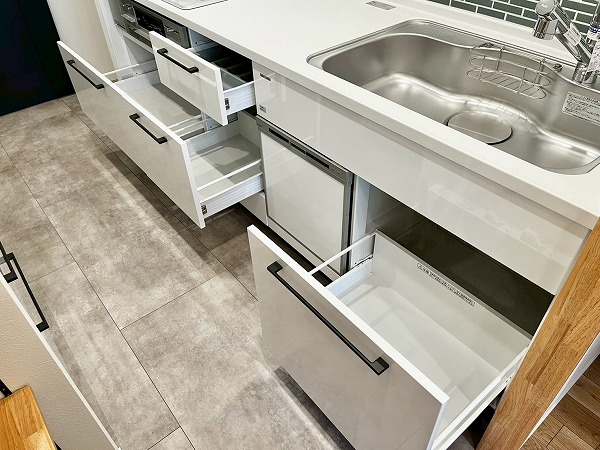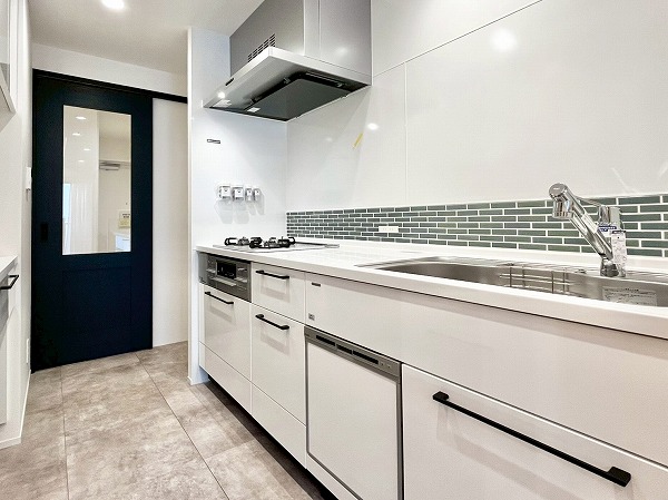 メインルームからシームレスに繋がるシステムキッチンは3口コンロに食洗機と、最適な環境を完備。ダイニングにいるご家族や友人と談笑しながら楽しくお料理することができます。シンク下は深めの収納棚になっているので、圧力鍋やサイズの違うフライパンもすっきり入りそう。