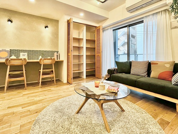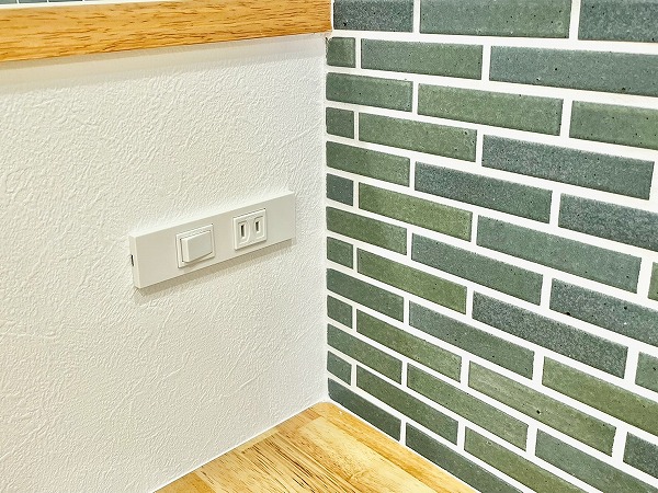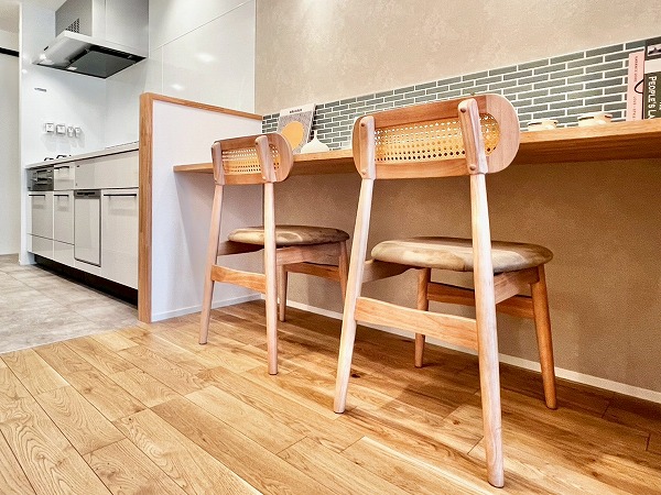 キッチン横に設けられたカフェカウンターが、このお部屋のアクセントになっています。壁に貼られたグリーンのタイルはまるでナチュラルなお部屋を彩る葉っぱのよう。休日の朝にはここでカフェモーニングを楽しむこともできそうですね。コーヒーを片手に、ちょっとした作業スペースとしても有効活用できそうです。