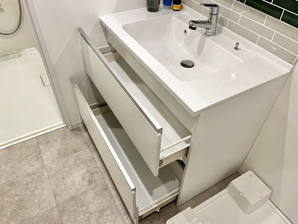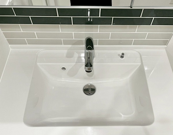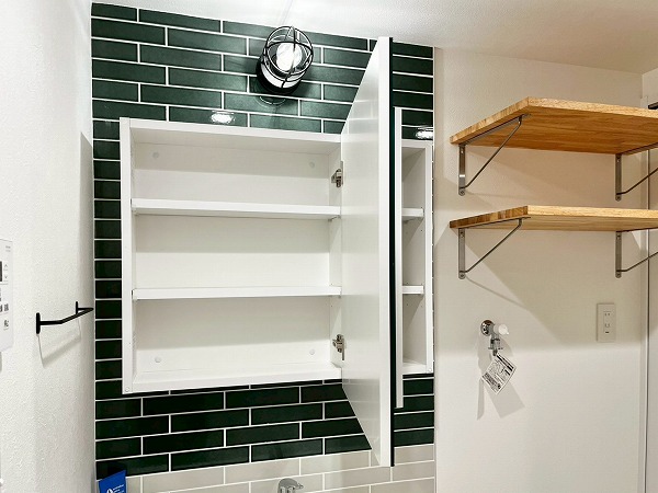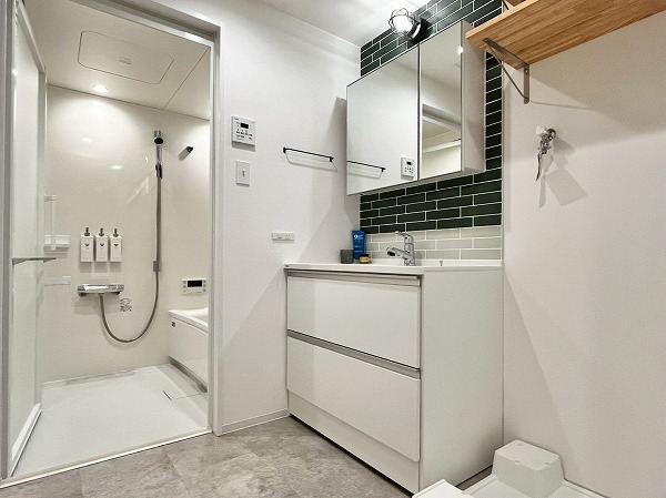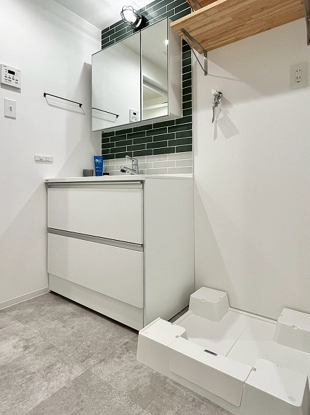 グレー調の床が洗練された印象のパウダールーム。キッチンスペースとおそろいのグリーンのタイルが、ぐっと空間を引き締めます。洗濯機を置いても圧迫感のない広々とした空間のおかげで、朝の身支度もスムーズに。