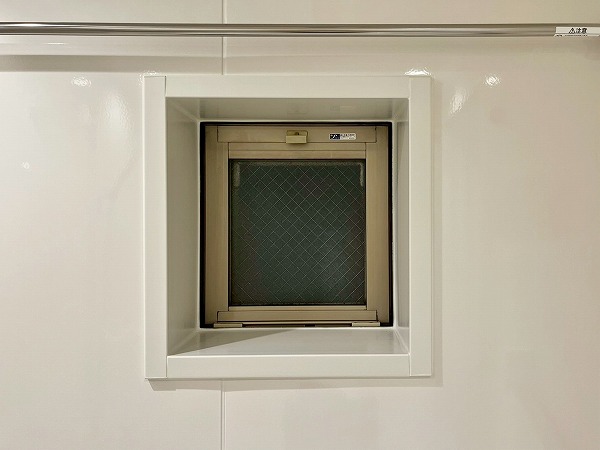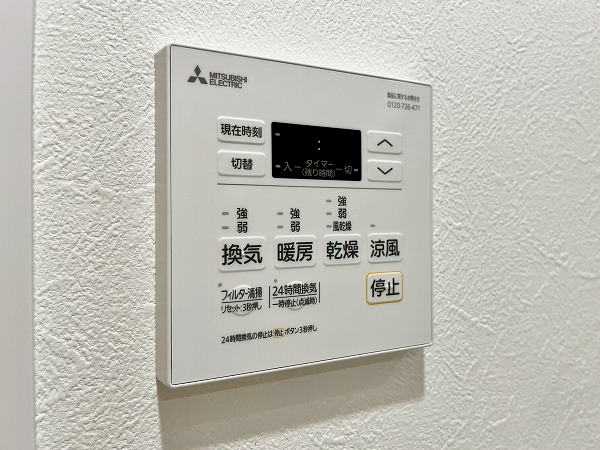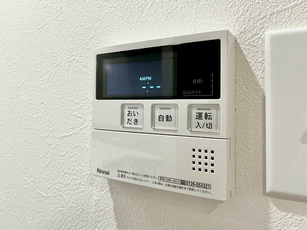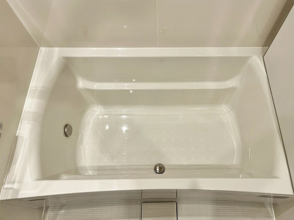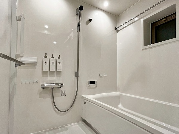 追い焚き&浴室乾燥付きのバスルームは、白を基調とした清潔感あふれる雰囲気。換気のできる小窓と水はけのよい床のおかげで、爽やかなバスルームを保つことができます。バスチェアを置いても狭さはあまり感じられなさそうです。