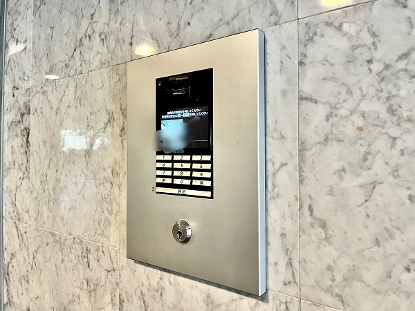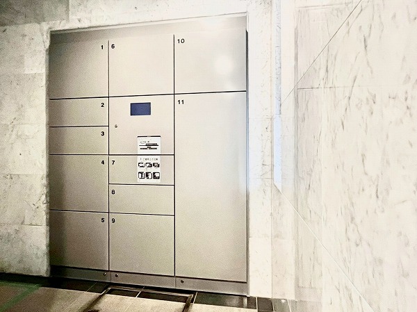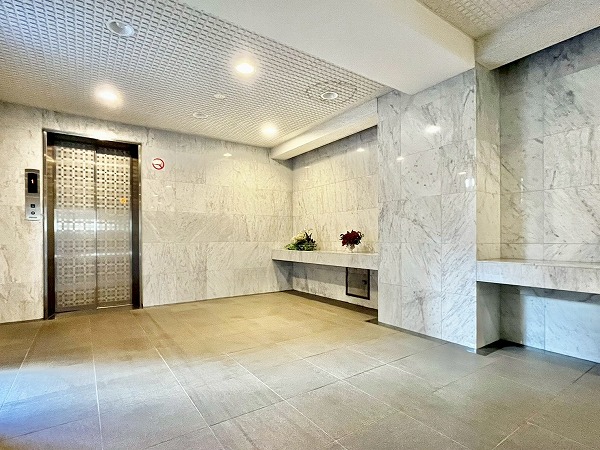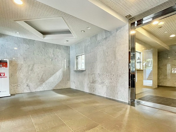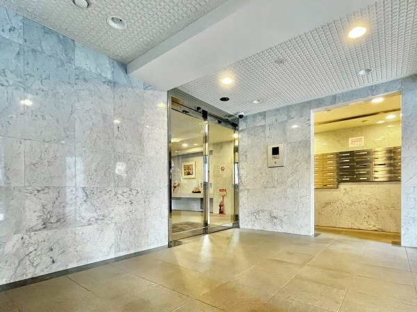 エントランスにはグレーの大理石調の壁を採用し、高級ホテルのロビーのような華やかさ。オートロック・防犯カメラに加え、管理人さんもいるようでしたので、セキュリティ面は問題ありません。宅配ボックスやAEDも完備されており、細やかな配慮がされています。