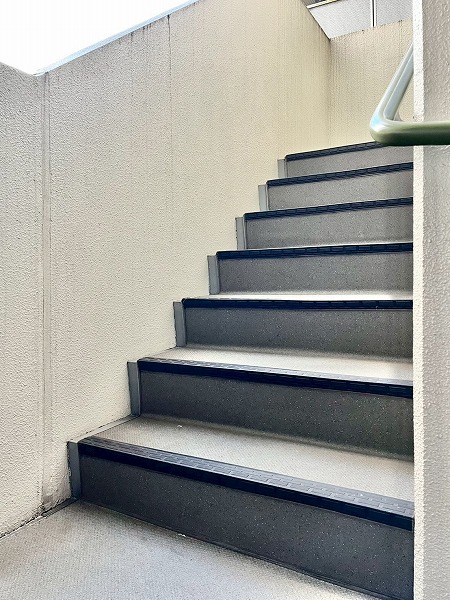 窓がなく空気がこもりにくい外廊下は、管理が行き届き、ごみひとつない清潔な印象。外階段は廊下の端と中央に設置されており、階段をご利用の際はお部屋に近いほうから上っていくことができます。