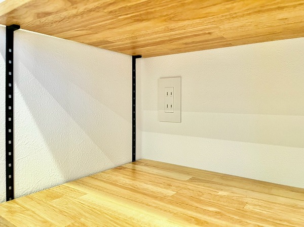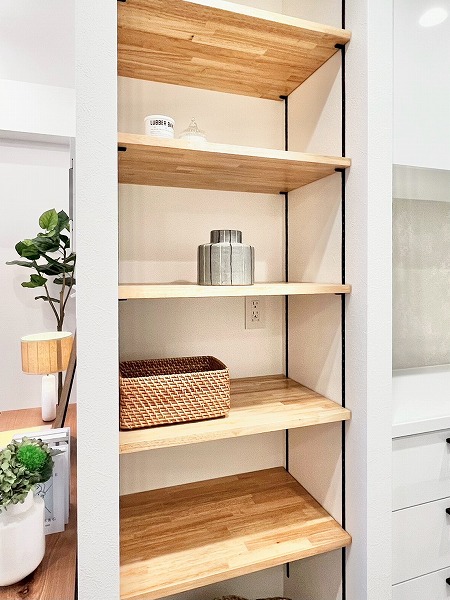光沢のあるホワイトのカップボード。たくさんの食器を綺麗にしまうことができるので、毎日大活躍しそうです。コンセントが左右に設置してあるので、家電好きの方はコーヒーメーカーや炊飯器などのコレクションにぴったり。お料理の下ごしらえから盛り付けまで、ちょっとした作業スペースにも使えそうですね。