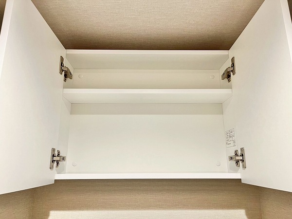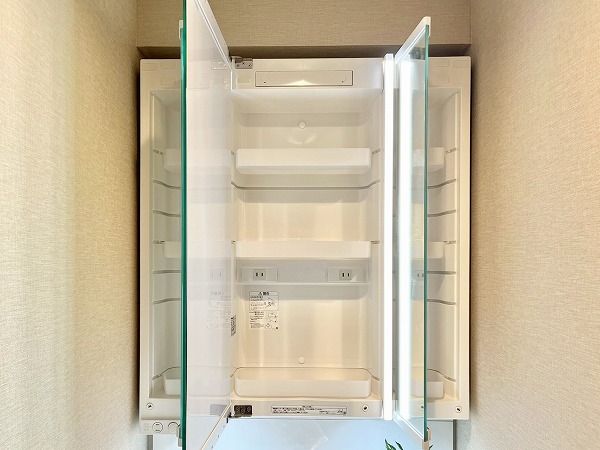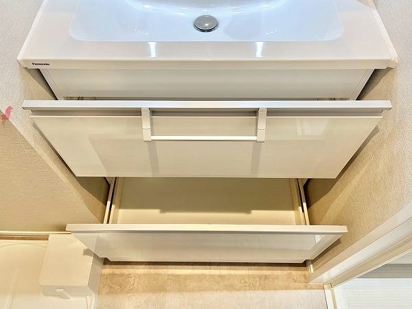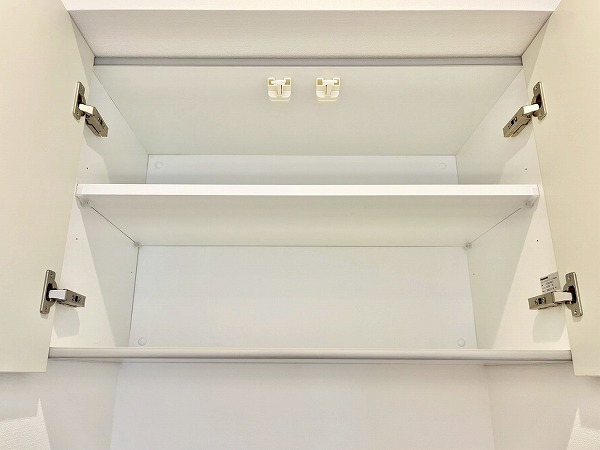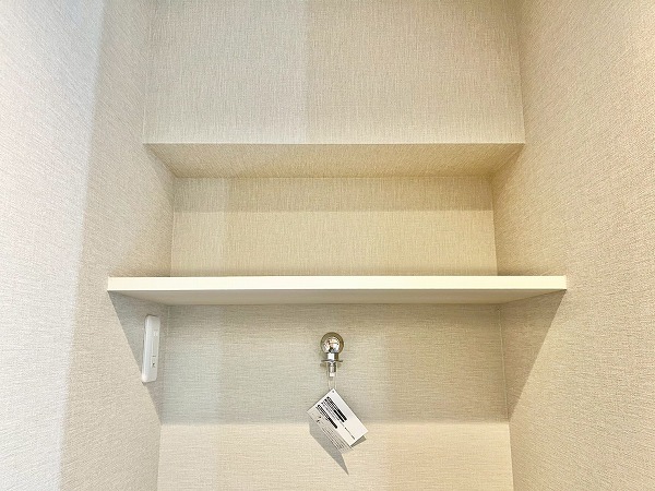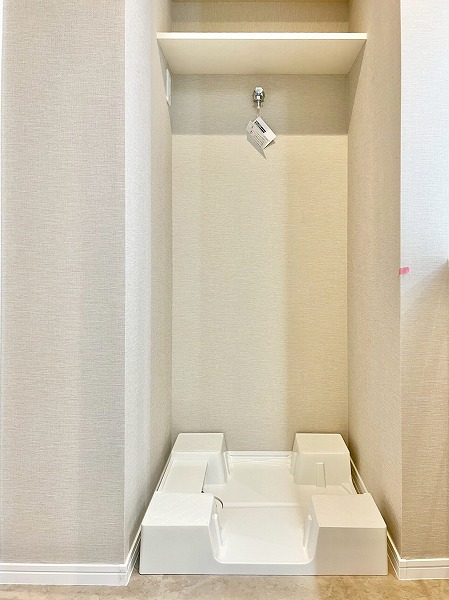 パウダールームには洗濯機置き場・洗面化粧台・バスルームが集合。入浴後にお洗濯物を回したり、そのまま髪を乾かしたりと毎日の身支度がこの空間1つで完結し、効率的です。上部のシェルフや洗面台下にはお掃除用具やリネン類を置くことができ、使い勝手の良さを感じます。