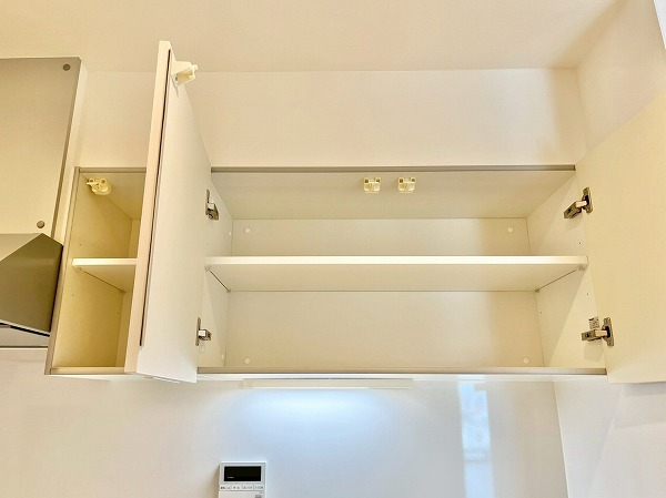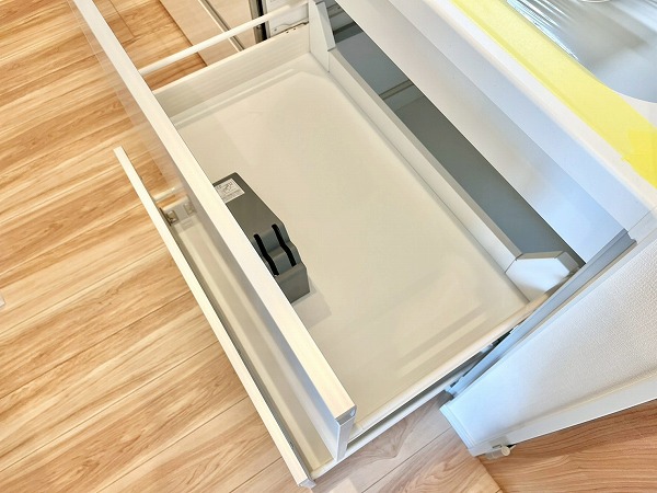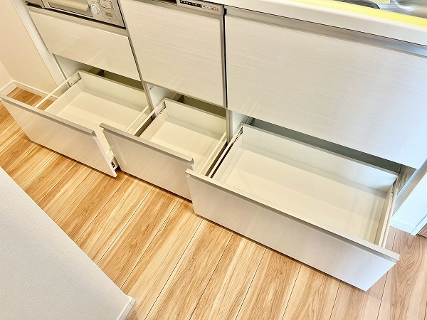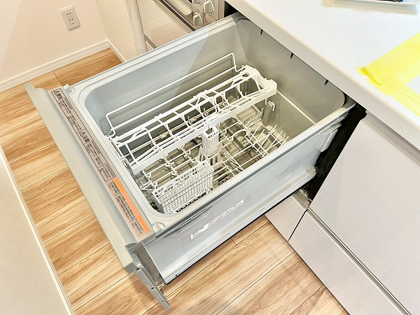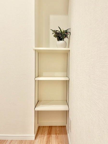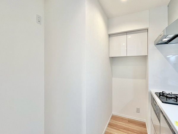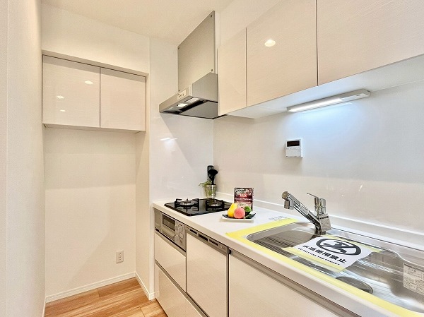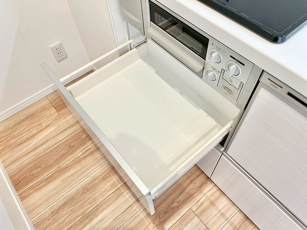 キッチンは壁付きで、お料理に集中できる環境。匂いがお部屋に流れにくい半独立タイプでありながらメインルーム内にあるため、毎日のお食事はサーブしやすいのがポイントです。シンク下には食洗機、突き当りにはシェルフなども置くことができ、ストレスフリーに使える機能的な空間。