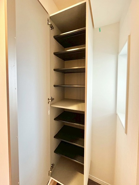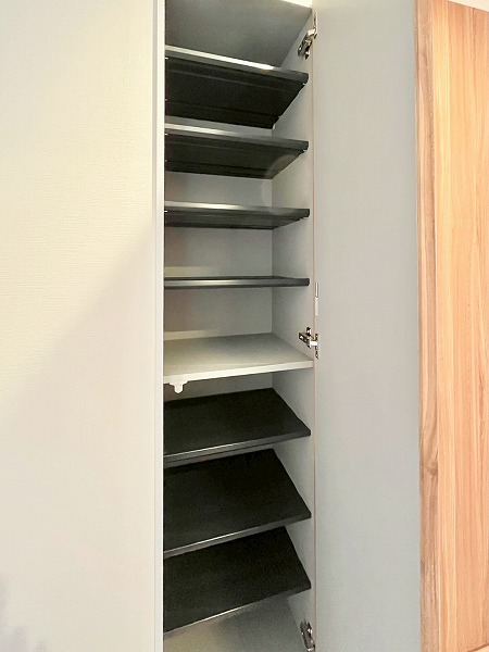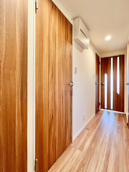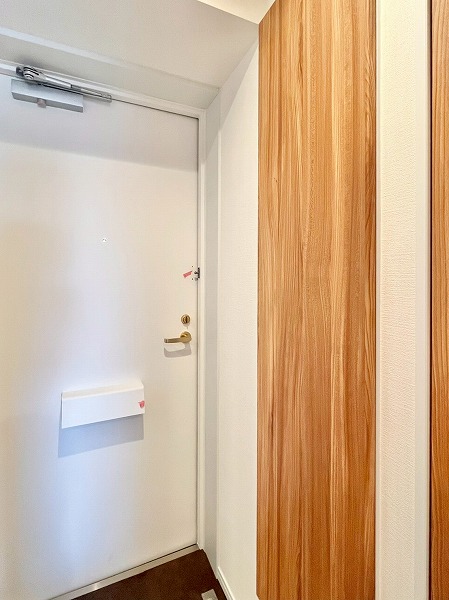 玄関扉を開けると、両側に同サイズのシューズボックスを設置。シーズンごとにシューズを分けたり、パートナーとひとりひとつずつ使うのも便利そうです。木目調の廊下の先には、デザインがさりげなくあしらわれたメインルームの扉が見え、温かで落ち着いたお部屋の顔を演出します。
