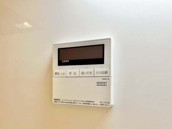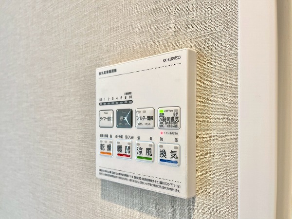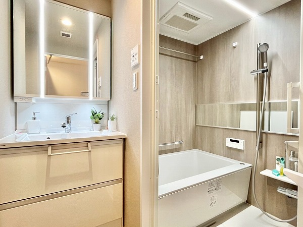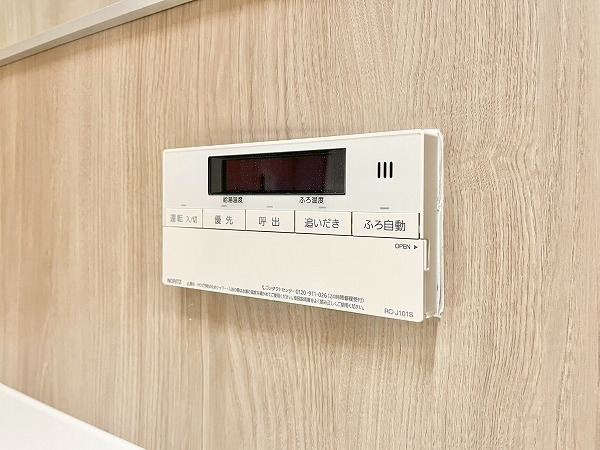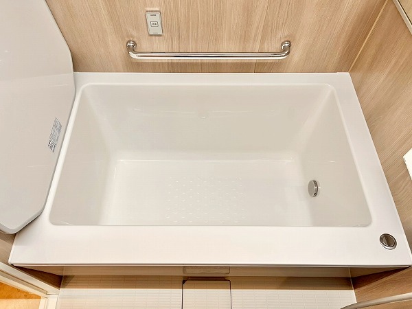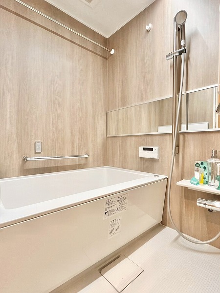 バスルームにはヒノキを思わせる柔らかな木目調パネルを採用。バスタブには追い焚き機能が搭載され、ゆっくりと身体を休められるリラックス空間に仕上がっています。浴室乾燥機能を使えば、梅雨時のお洗濯物問題も解決です。