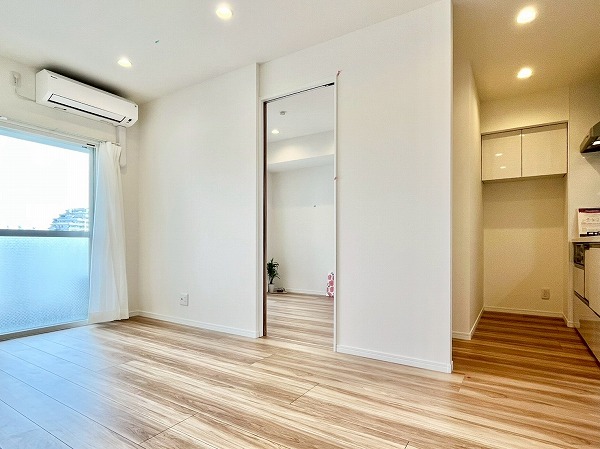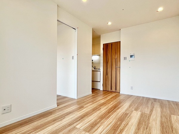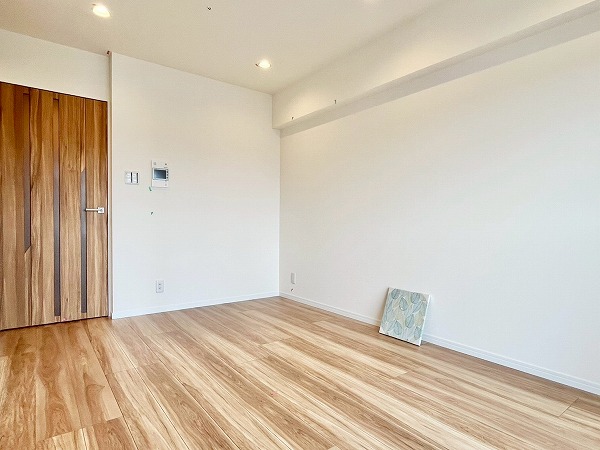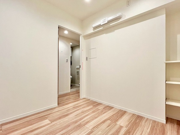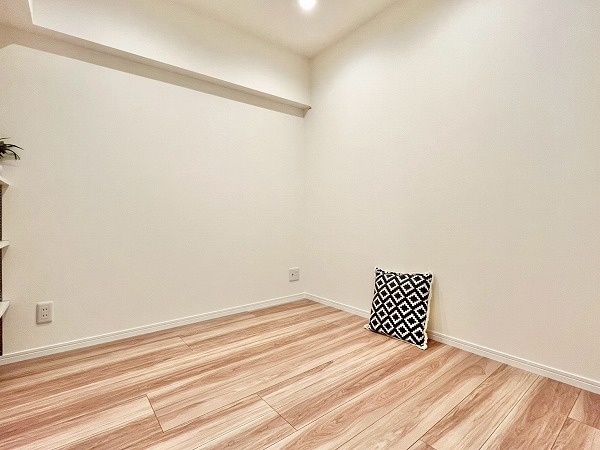 6階に位置する1SLDKのお部屋は、外の雰囲気とは一転。オフホワイトのクロスと足元の木材の組み合わせが居心地の良い、穏やかな生活空間に仕上がっていました。玄関周りのシューズクローゼットやサービスルームが付いて、パートナーとの2人暮らしでも荷物の置き場所に困ることはありません。