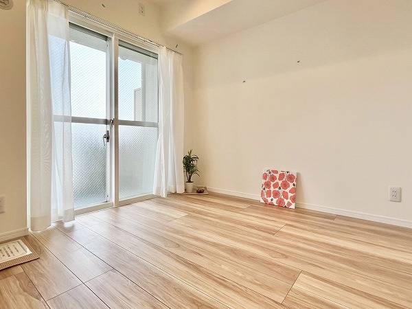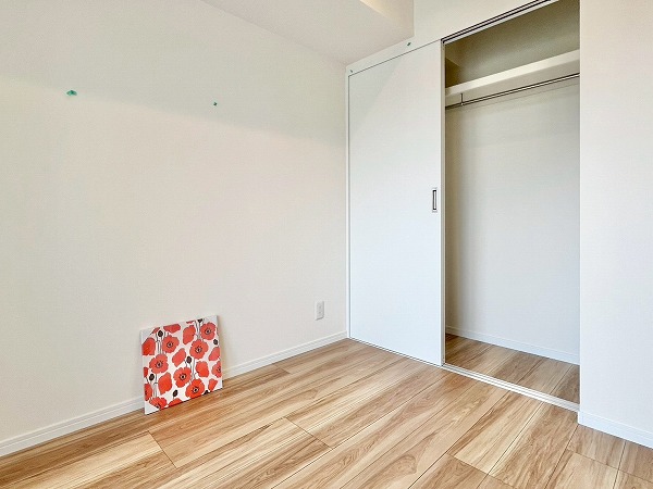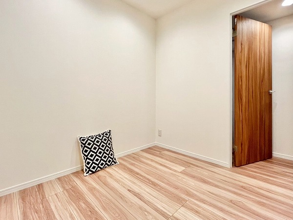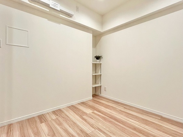 メインルームに隣接する洋室は東向きのため朝日が気持ちよく入り、寝室にぴったりです。およそ4帖とややコンパクトなサイズ感ですが、居室内の収納は引き戸タイプになっており、場所を取らずに室内をすっきりとさせておけます。大きめのベッドでもちょうどよく置けそうでした◎