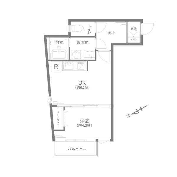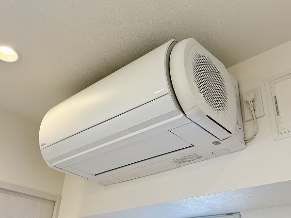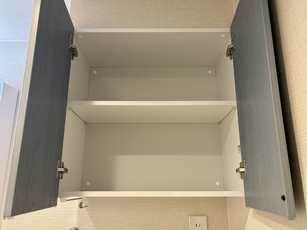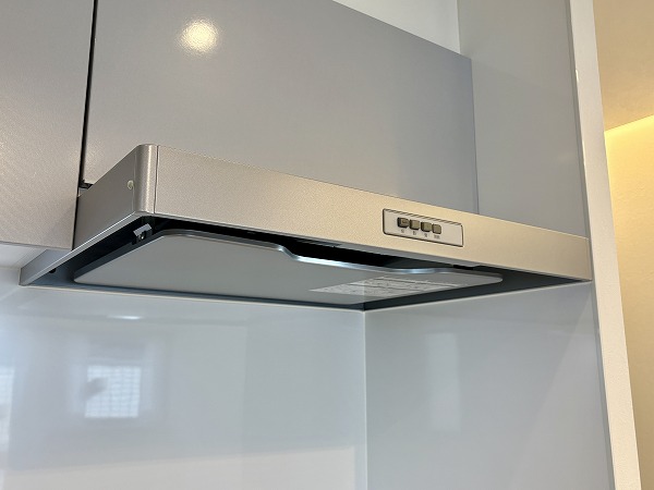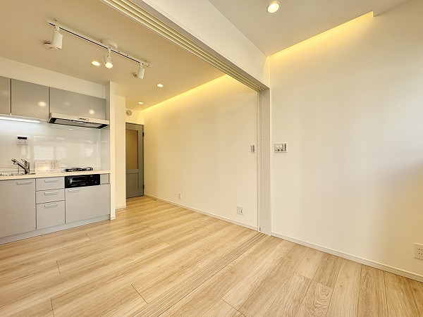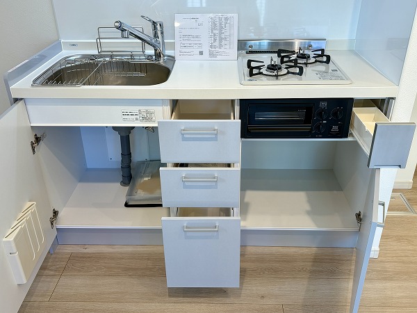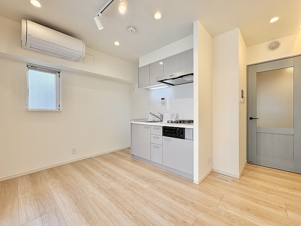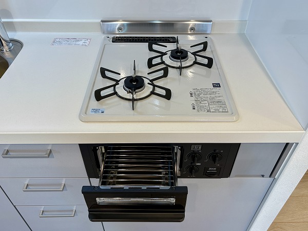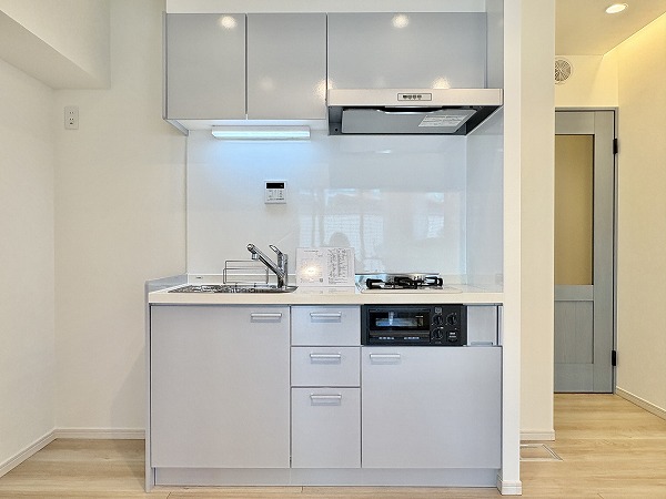 ライトグレーでまとめられたキッチンは、主張しすぎず室内に自然と馴染むデザイン。壁付仕様のため調理に集中しやすく、煙や匂いが居室に広がりにくいのもポイントです。ワークトップはややコンパクトですが、グリル付き2口コンロを備え、自炊派の方にも満足いただける仕様に。