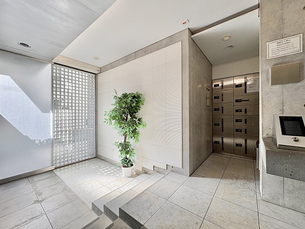 オートロックと防犯カメラが設置されたエントランスは、安心感のある第一印象。自動ドアなので、雨の日や荷物が多い日もストレスなく通行できますよ。