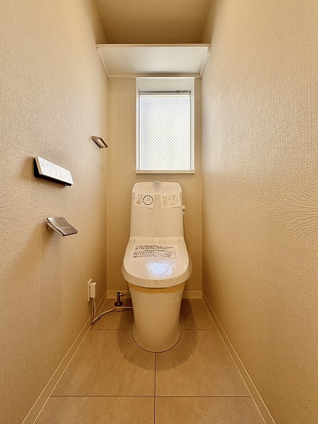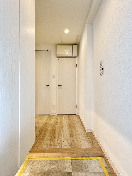 玄関から続く廊下はL字型に設けられ、室内が直接見えにくい設計。来客時もプライバシーが守られます。トールタイプのシューズボックスを備え、収納力も十分。フットライトが夜間の足元を優しく照らしますよ。