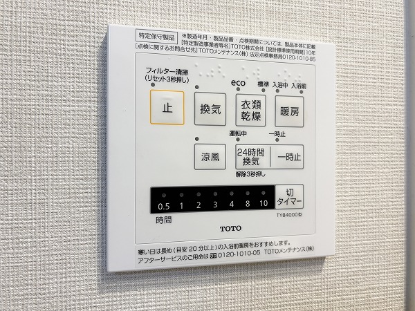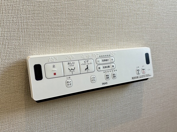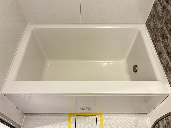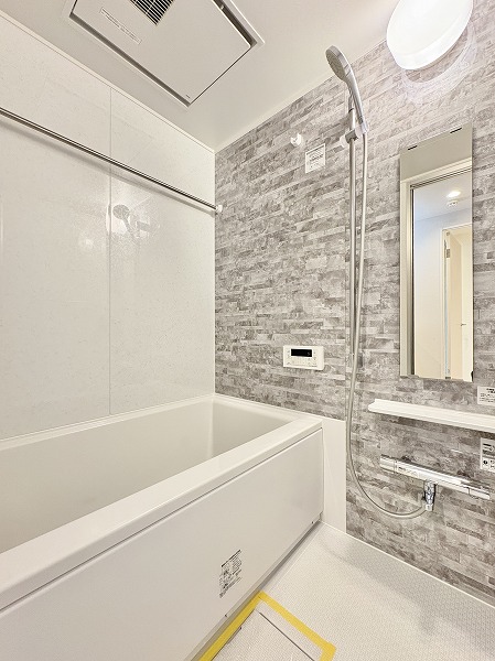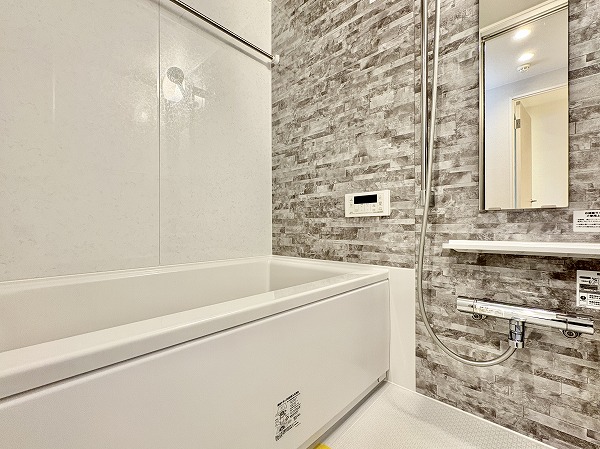 ストーン調の壁面が印象的なバスルームは、1日の疲れを静かに癒してくれる雰囲気。カウンター付きでボトル類を整理しやすく、床周りがすっきりするのも嬉しいですよね。さらにバスタブには追い焚き機能を完備し、ワンタッチで湯舟を温め直すことも♡