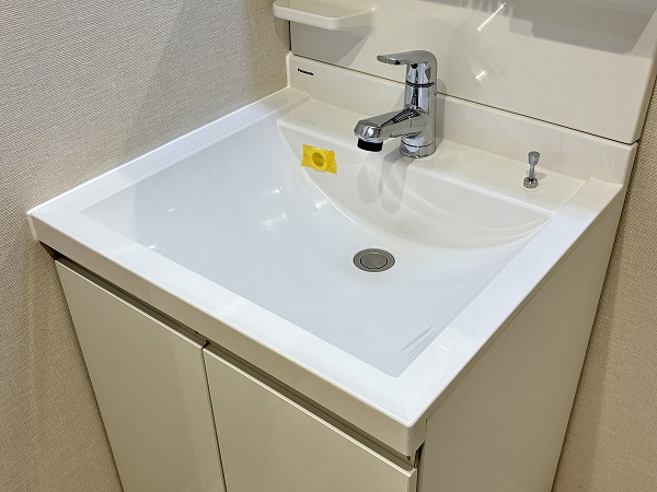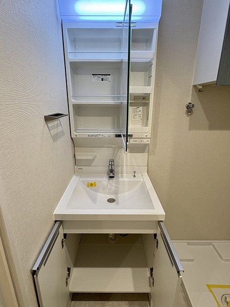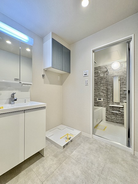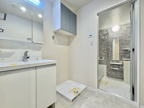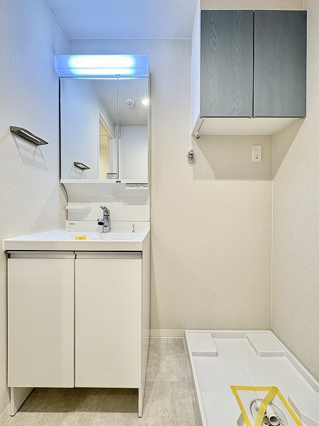 水回りをひとまとめにしたサニタリールームは、動きやすく管理もしやすい設計。ホワイト基調の内装が清潔感を際立たせていました。洗面化粧台のキャビネット収納は実用性が高く、空間をすっきりと保てるのでお掃除もスムーズ。