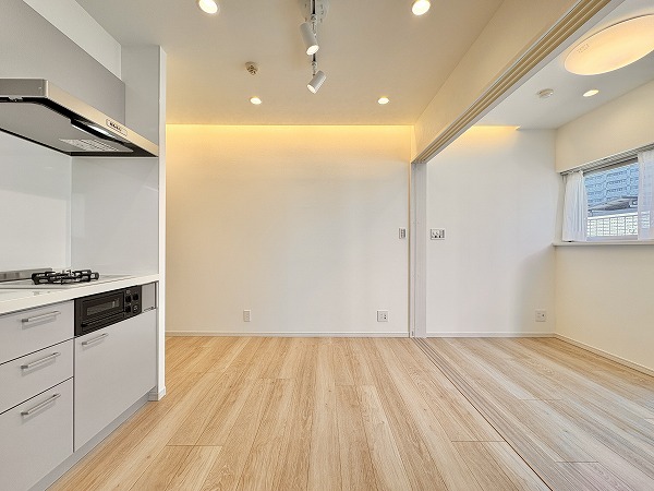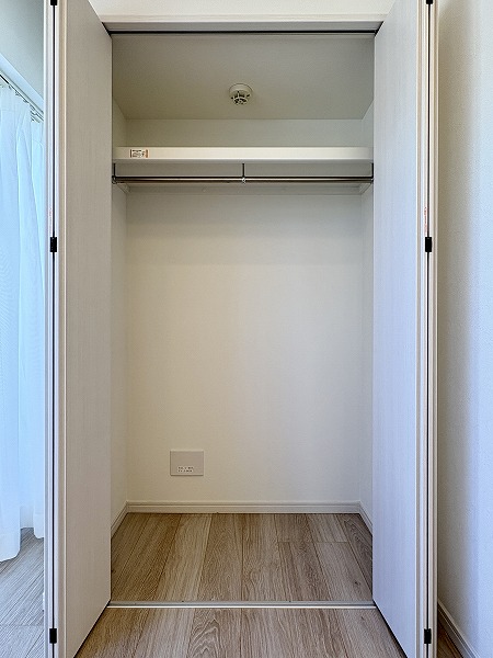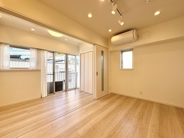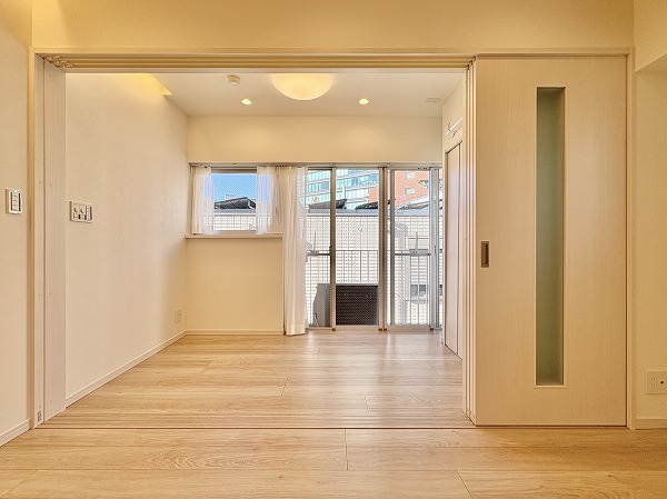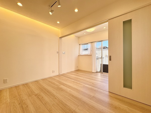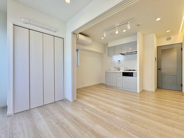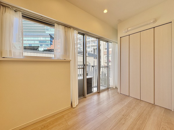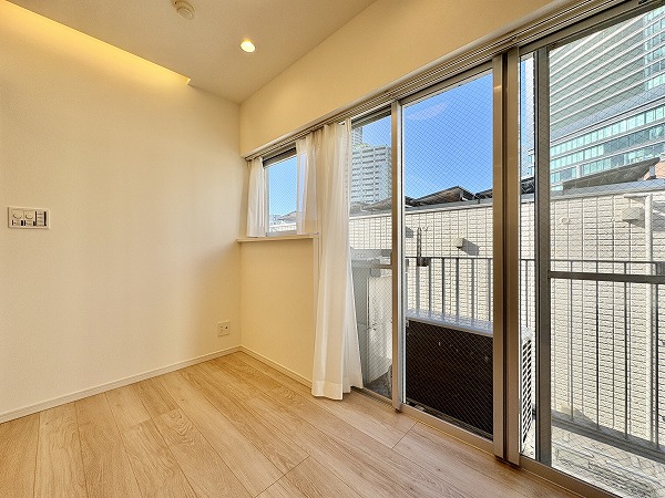 寝室としてもワークスペースとしても使いやすい約4.3帖の洋室。大きな窓があるため圧迫感は感じにくく、自然光が空間を明るく演出。スライドドアを活かせば、ひと続きのワンルーム感覚にも。クローゼット付きで、生活感を抑えた空間作りが可能です。