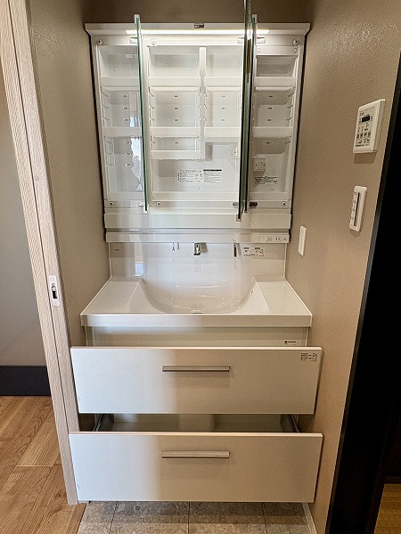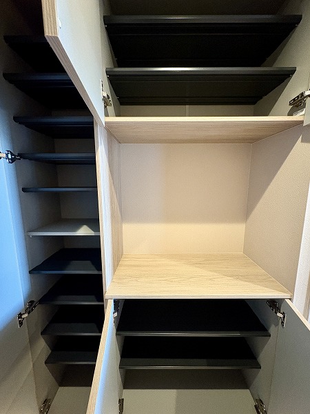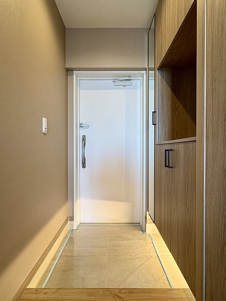第一印象から温かみを感じる玄関は、姿見付きシューズボックスに加えて廊下収納も完備。外出前のチェックや日用品の整理がスムーズにでき、常に整った状態でゲストをお出迎えできそう✧