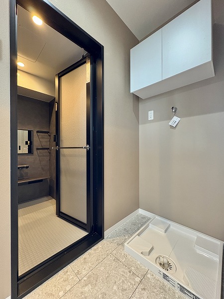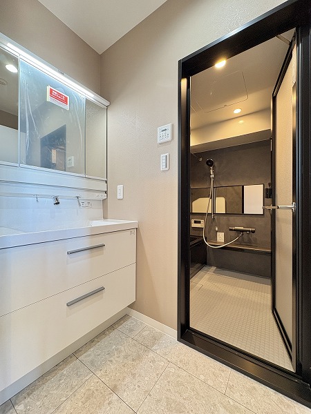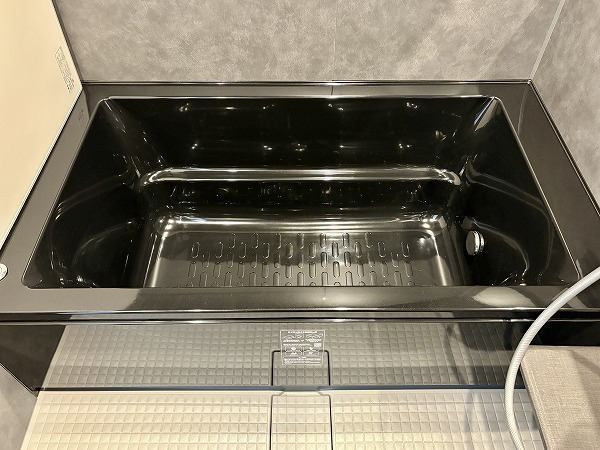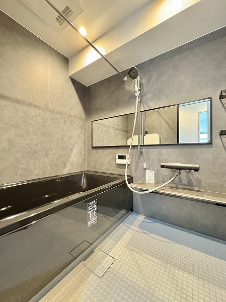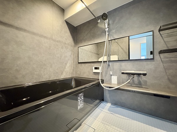 大人モダンなブラック×グレーのバスルームは、ゆったりしたサイズ感で疲れを癒す空間。浴室乾燥機を活用すれば、雨の日や梅雨時の洗濯もスムーズに。さらに湿気を逃がして清潔に保てるので、気持ちよく毎日のバスタイムを楽しめます。