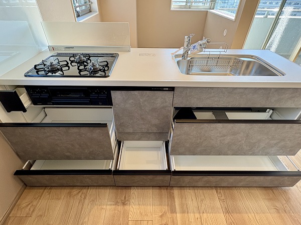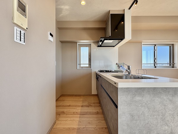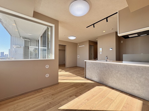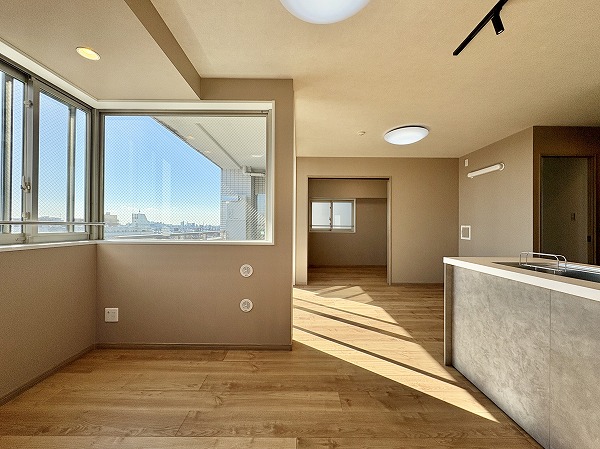 訪れたのは最上階の南東向き角部屋。LDKは大きな窓に囲まれ、自然光がたっぷり注ぎ込みグレーの壁紙が落ち着いた大人の雰囲気を演出。リビングと洋室はスライドドアで仕切られ、使い方に応じて開放感もプライベート感も自在です。キッチンはペニンシュラタイプで、カウンター越しにリビングを見渡せるため、料理をしながら家族や友人との会話もお楽しみいただけます♡
