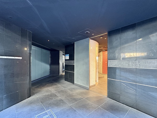 赤く輝くタイルが視線を集めるエントランス。曲線を描く壁面デザインが柔らかさと動きを演出し、訪れるたびに特別感を感じさせます。オートロック付きで、セキュリティ面も安心。