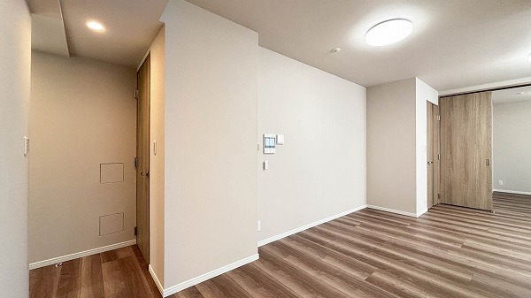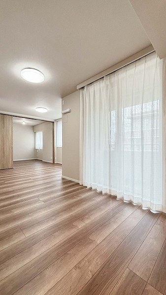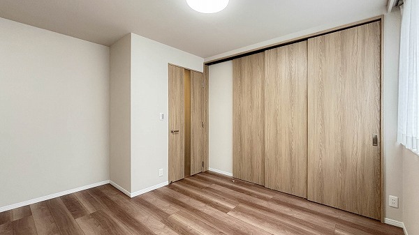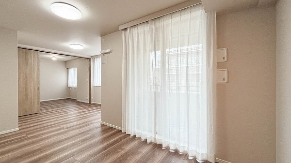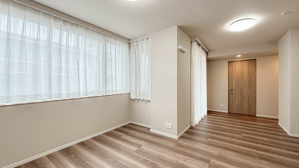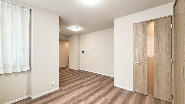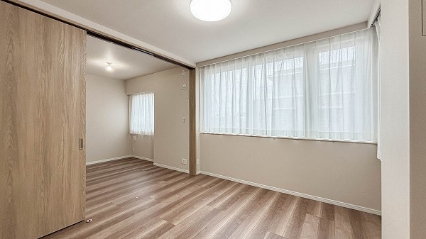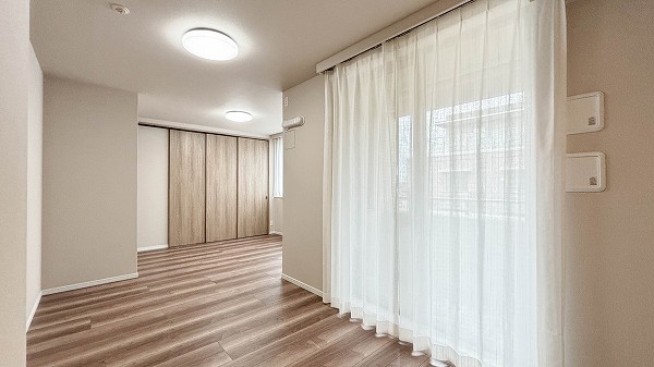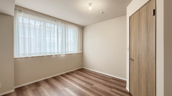 約7.3帖の洋室は、バルコニーからの光を取り込むことで角住戸でなくとも明るさをしっかり確保しました☀2つの洋室はいずれもメインルームを経由する動線設計。自然とリビングに家族が集まり、声や気配が程よく交わる暮らしが叶いますよ。