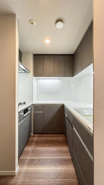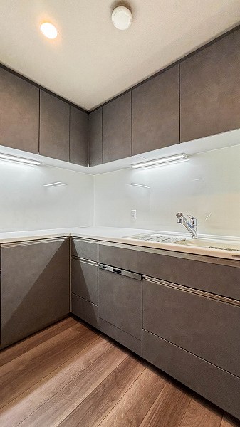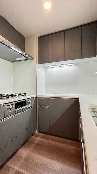 約3.3帖のキッチンスペースは、包み込むようなコの字型。立った瞬間に必要なものが視界と手の届く範囲に揃い、自然と料理に集中できる環境です✦3口コンロとグリルで手際よく調理が進み、食洗機が後片付けをスマートにサポートしてくれますよ。