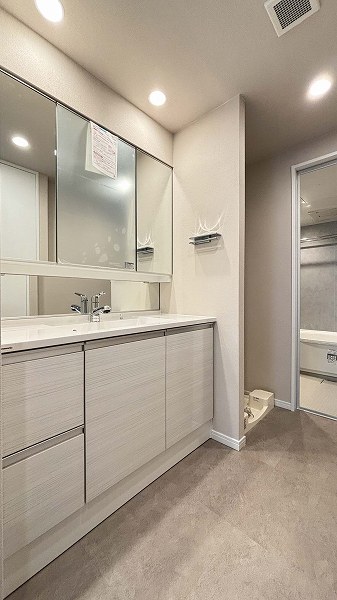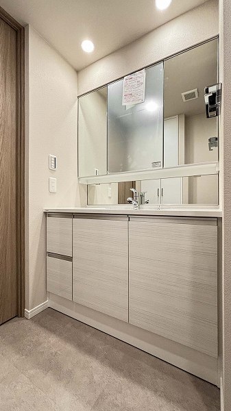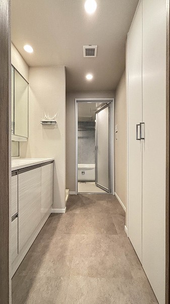 洗面化粧台・洗濯機置き場・バスルームがひとつに整ったパウダールームは、忙しい朝も心地よくスタートできるレイアウト。3面鏡付きの洗面化粧台は収納も充実し、タオルやコスメを美しく整頓できます。洗面台横に洗濯機置き場があり漬け置き洗いも楽々◎