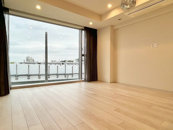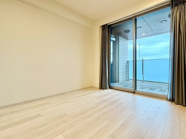 メインルームの魅力は何といってもこの大きな窓。夕方には西日を取り込み、温かみを感じるお部屋になりそうです。眺望には住宅街がなく、大きさの割にプライバシーが気にならないのもポイント。窓際にソファを設ければ、1日の空模様の変化を感じる豊かな暮らしに。
