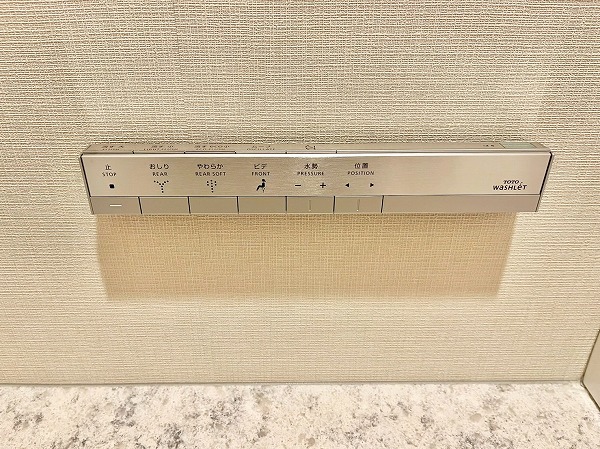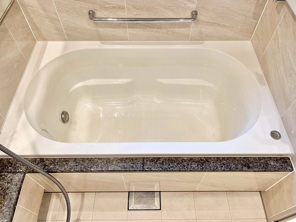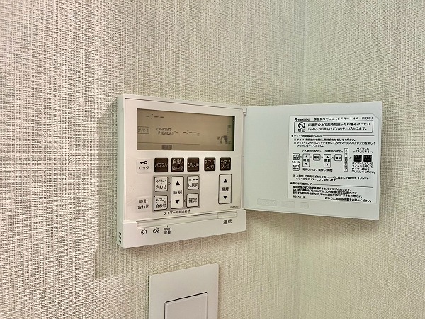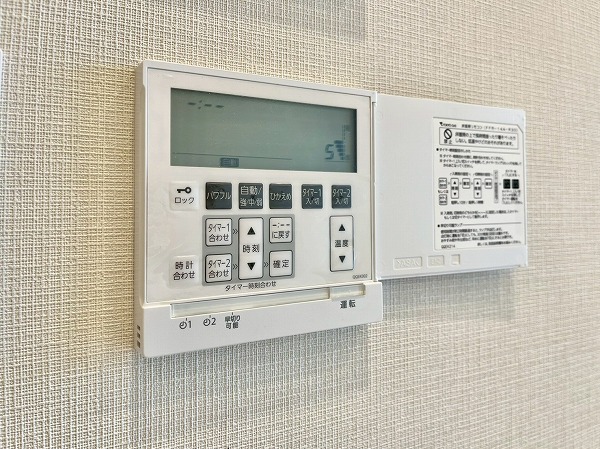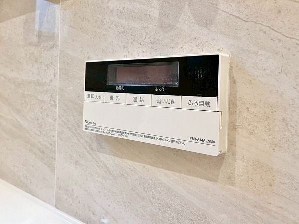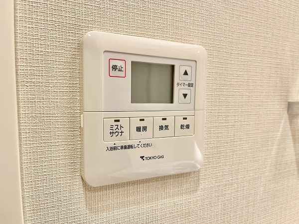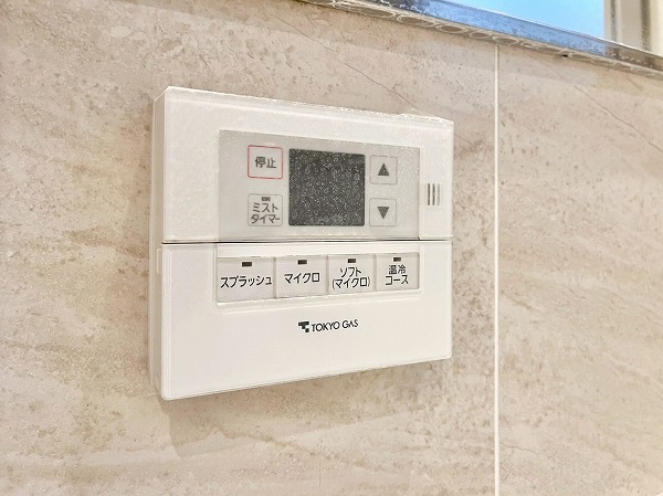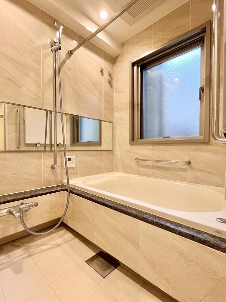 光沢のあるペールベージュのパネルが高級感を演出するバスルーム。ブラックタイルで縁取られたバスタブには追い焚き機能を備え、身体を芯から温めてくれます。浴室乾燥機に加えてミスト機能も搭載されており、日々のバスタイムをワンランクアップしてくれる空間です。