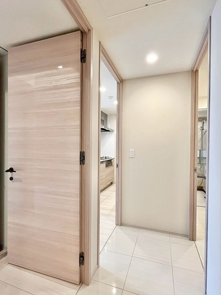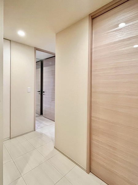 シームレスなデザインのシューズボックス・ミラーが並び、すっきりとした印象の玄関。足元には艶のあるホワイトのタイルが敷かれ、ゲストに美しいお部屋の顔を演出してくれます。廊下には曲がり角が設けられており、玄関からの視線をさりげなく遮ってくれるのもポイント。