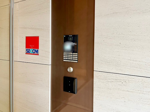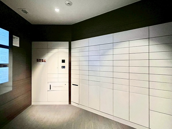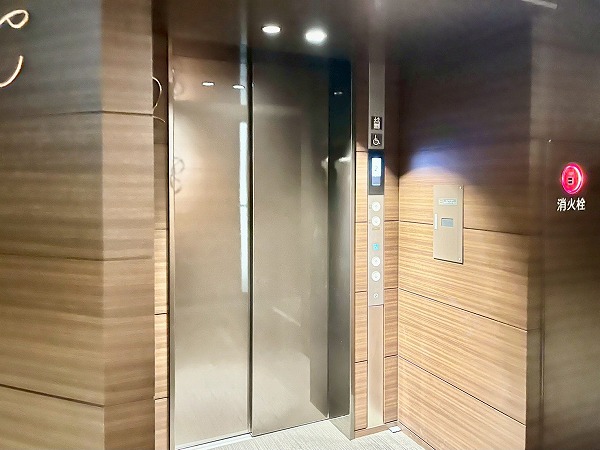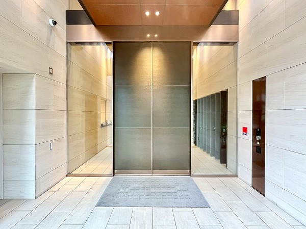内廊下は照明が絞られ、高級感漂う雰囲気で迎えてくれます。途中には宅配ボックスや駐輪場への入り口も設けられ、天候に左右されずアクセスしやすい造りです。エレベーターは4基設置され、お部屋の位置に応じて使えるエレベーターが決まっており、セキュリティ面にも配慮がなされています。