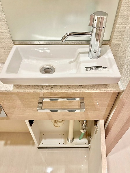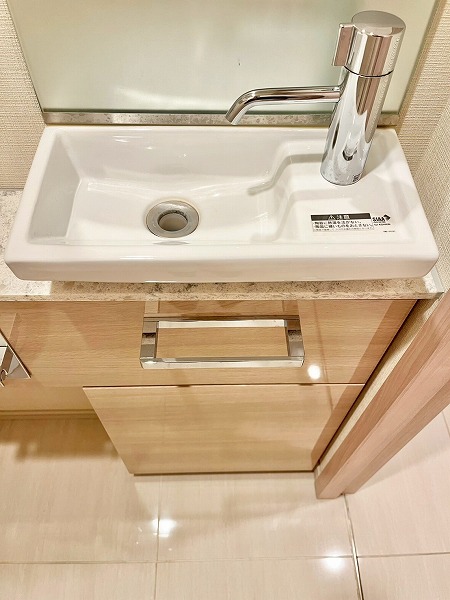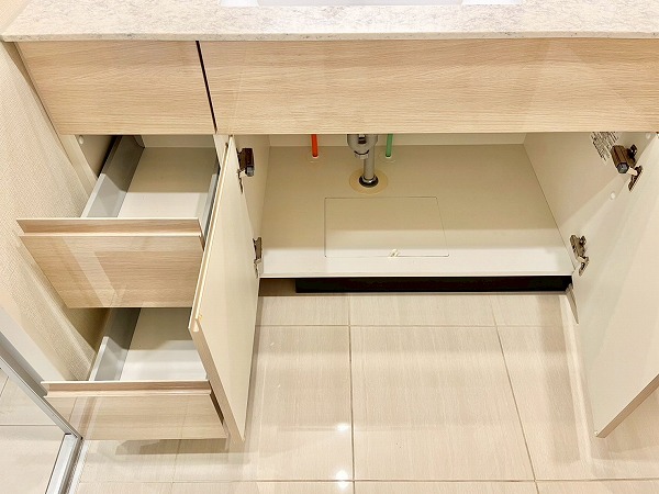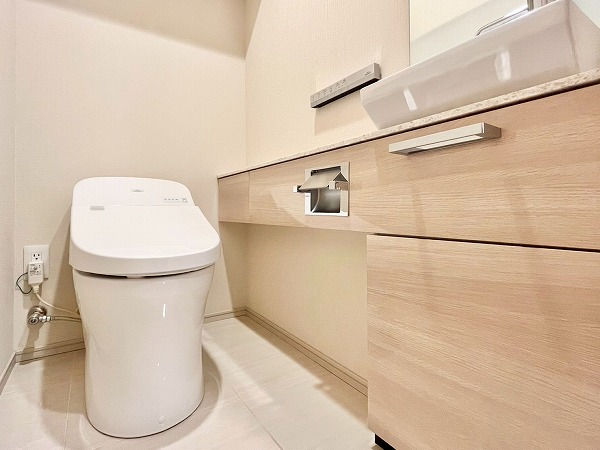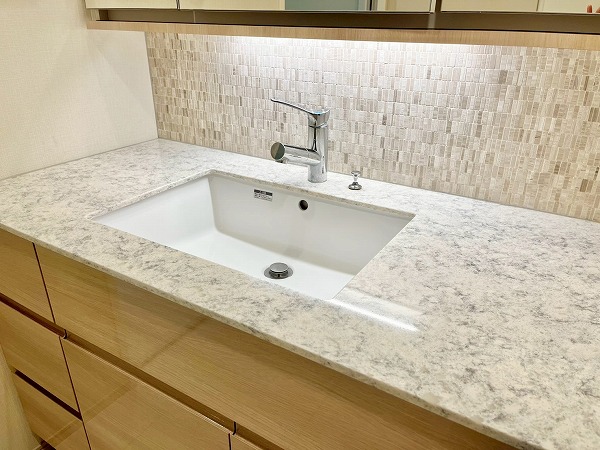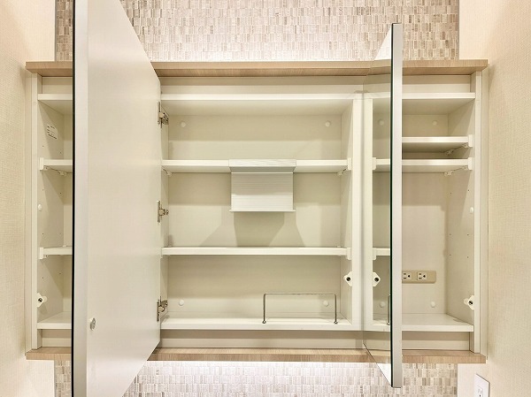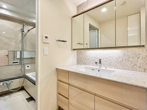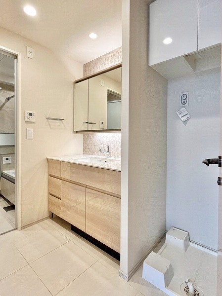パウダールームには浮遊デザインのミラーがアクセントの洗面化粧台を設置。光が柔らかに照らし出され、気持ちよく身だしなみを整えることができます。ワークトップが広めの造りは、使用頻度の高いスキンケア用品や歯ブラシを置いておいても邪魔にならず、使いやすい造りです。