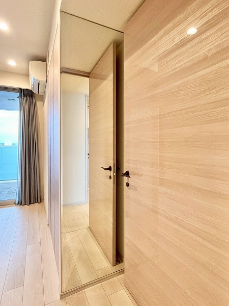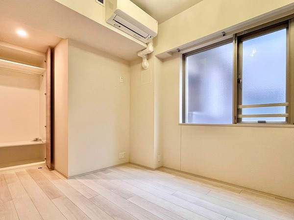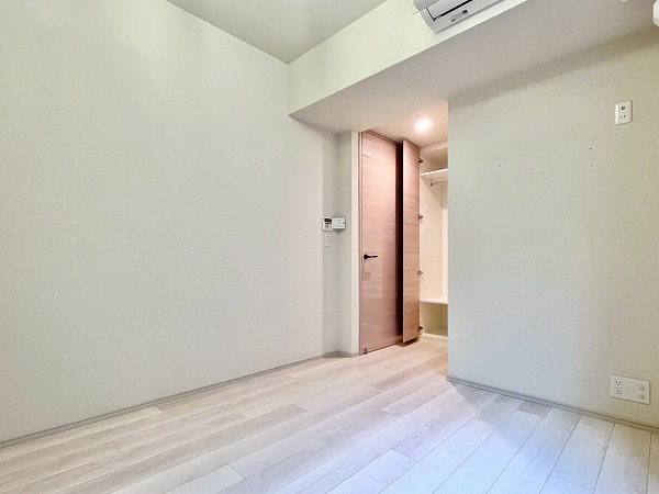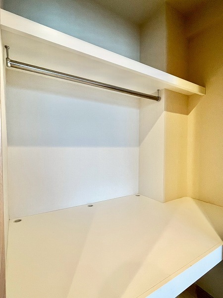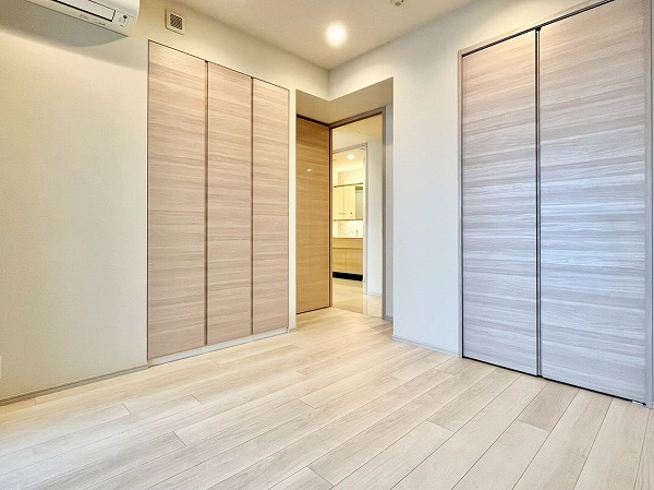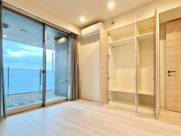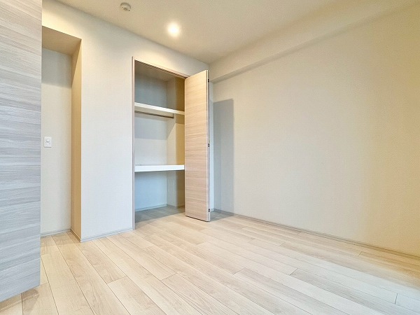 寝室にぴったりなおよそ6帖の洋室は、入り口に壁付きのミラーが設けられ、お出かけ前にさっと身だしなみを確認できのが便利。2段式のマルチストレージ、高さのあるクローゼットを設け、衣装ケースや楽器などの大きな物も余裕で入る収納力が魅力です。