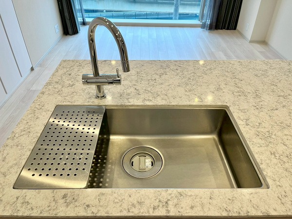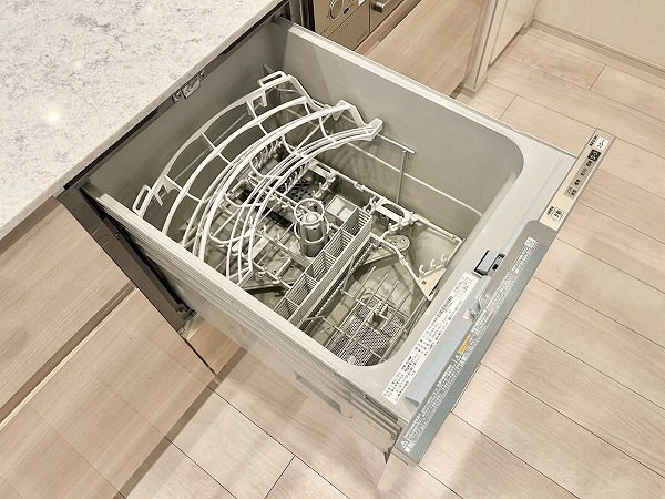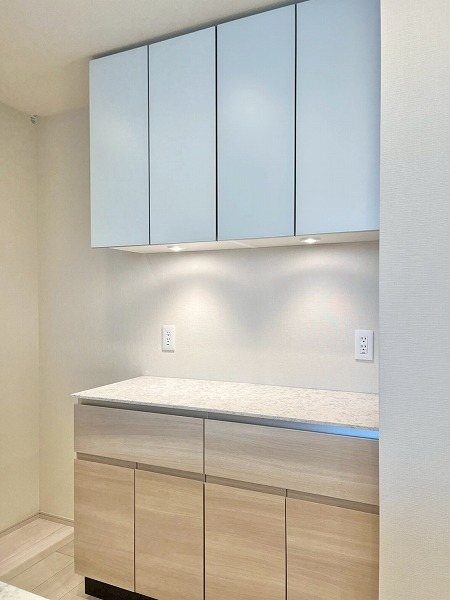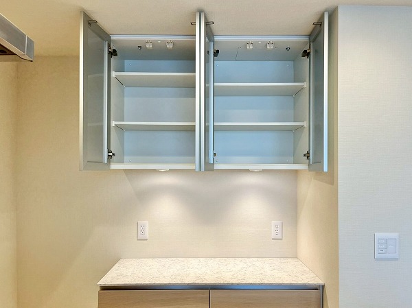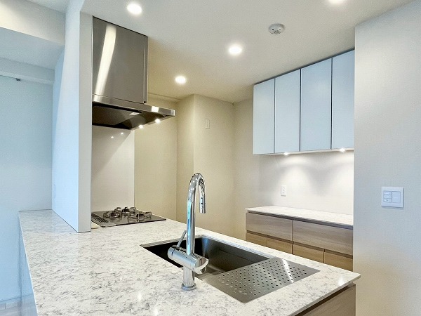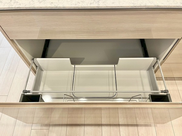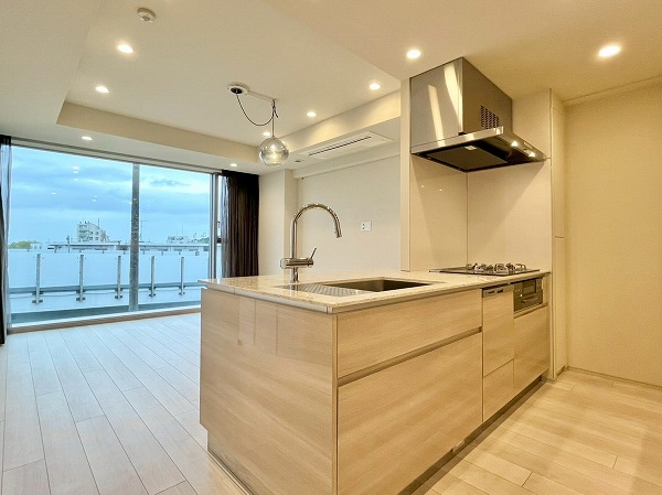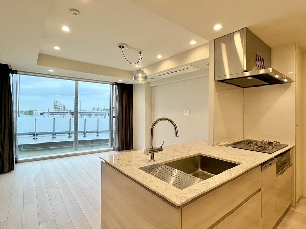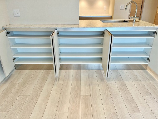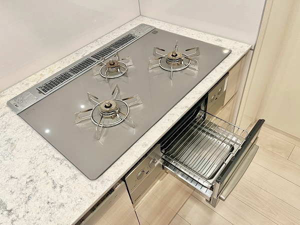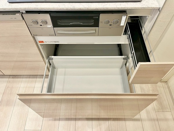 オープンキッチンは3口コンロと食洗機を備え、機能性の高い設計。シンクに立てば窓の外へと視線が抜け、料理中も開放感のある時間が流れます。背面にはカップボードを備え、お皿やカトラリーの出し入れもスムーズ。調理から配膳までを自然につなぐ、使い勝手の良いキッチンです。
