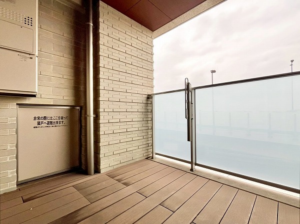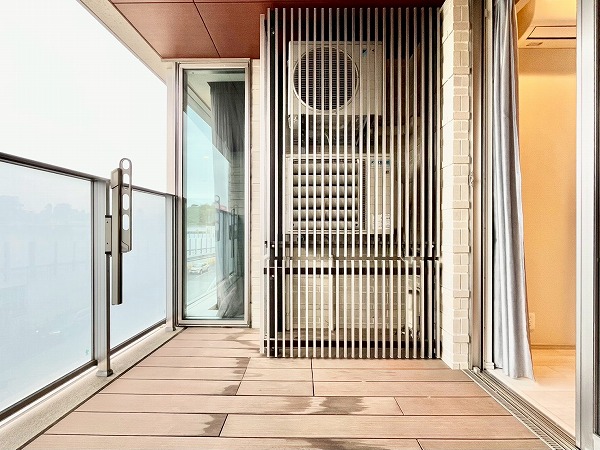 洋室から出入りできるバルコニーは、平干し用の物干しスタンドも置いておけそうなワイドな造りになっており、家事もスムーズに行えそう。庇が長めに設けられているので、急な雨が降っても洗濯物が濡れにくいのがありがたいですね。室外機などは脇の柵内にすっきりと収まり、室内から外を眺めても景観を邪魔しません。
