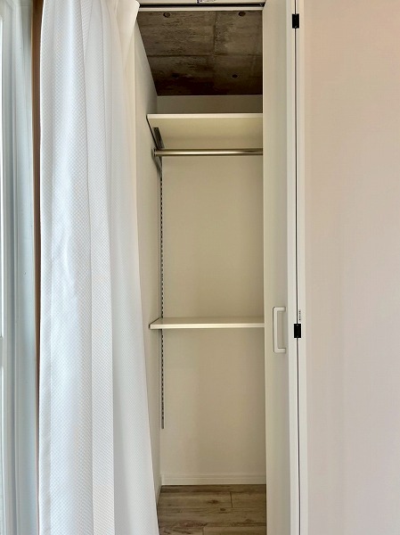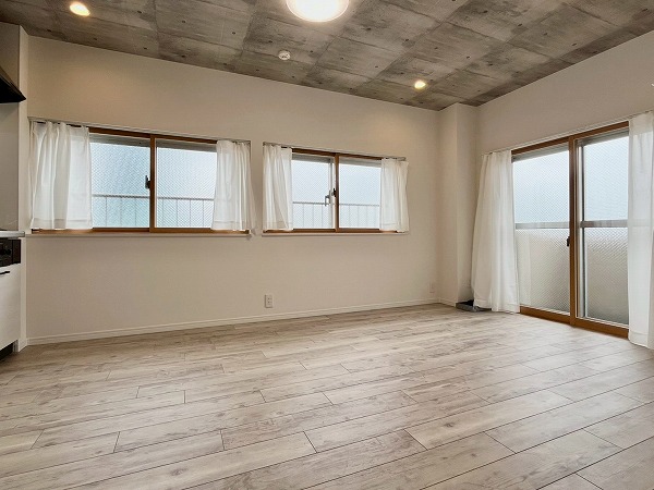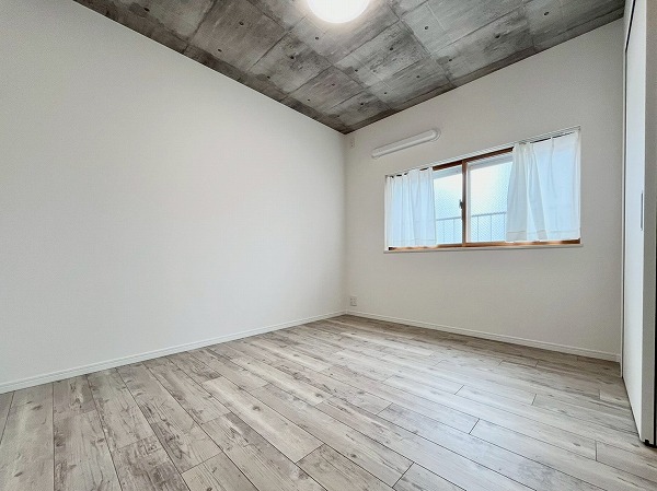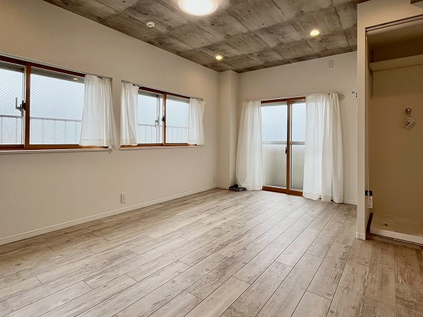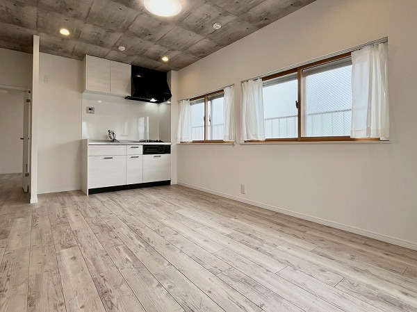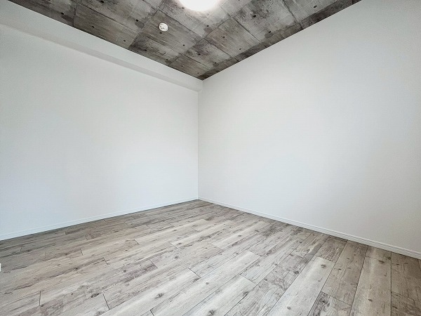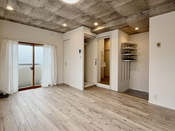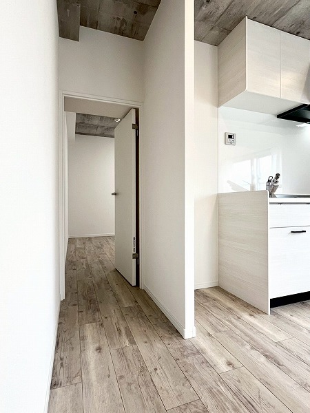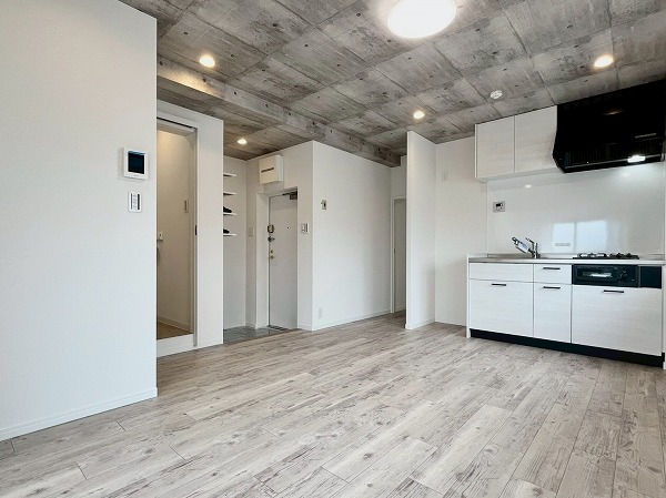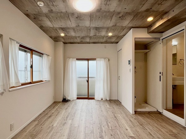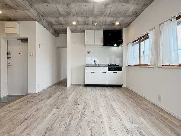 玄関からシームレスに繋がるLDKは、まるでスタジオのような雰囲気。ワンルーム感覚で空間を広く使えば、無骨なアイアン調の家具やミニマルなアイテムがよく映えそうです。天井にはコンクリート柄のクロスを採用し、断熱性の問題をクリアしながら無機質&クールな空間を実現しました。