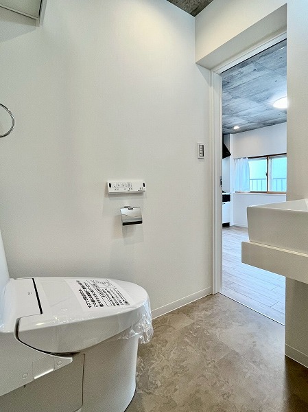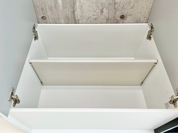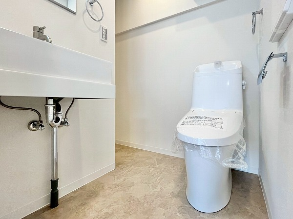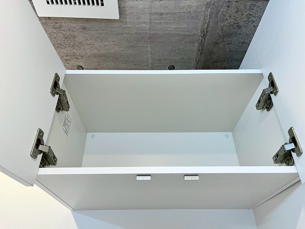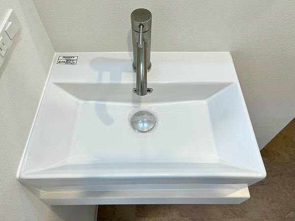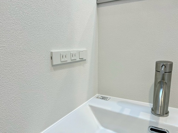 サニタリールームはトイレ・洗面台が集合し、機能的で効率的な空間。洗面ボウル脇にはコンセントが2口あるため、ドライヤーやアイロンの使用も問題なし。コンパクトながら実用性はしっかりと確保されています。上部の吊戸棚を上手に使うことですっきりとした空間が保てそうです。