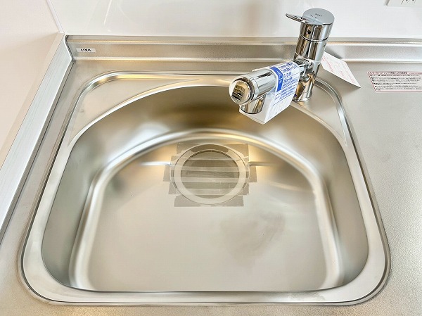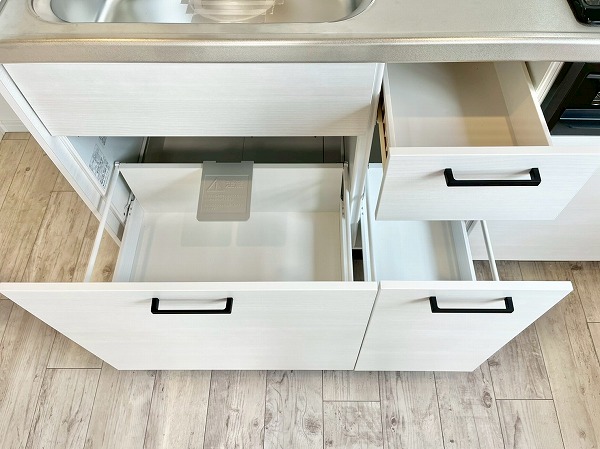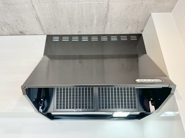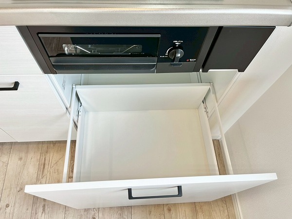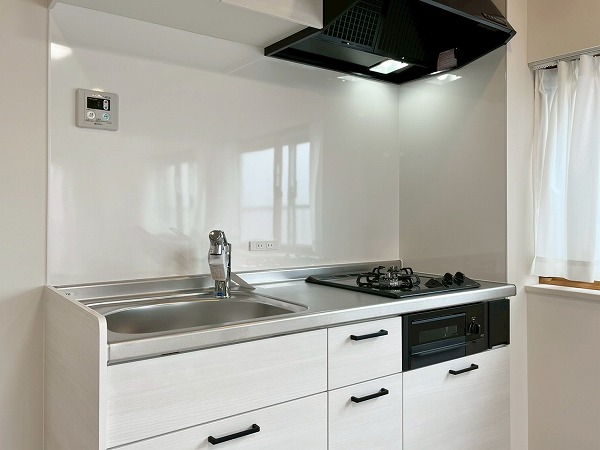 無駄を削ぎ落としたミニマルなキッチンはモノクロで統一されたデザインが、雰囲気を壊しません。コンロは2口、上下には収納を備え、食器や大きな調理器具もすっきりと収まります。コンパクトながら、日常使いには十分な機能性を兼ね備えたキッチンです。