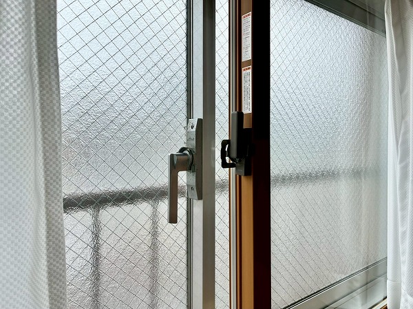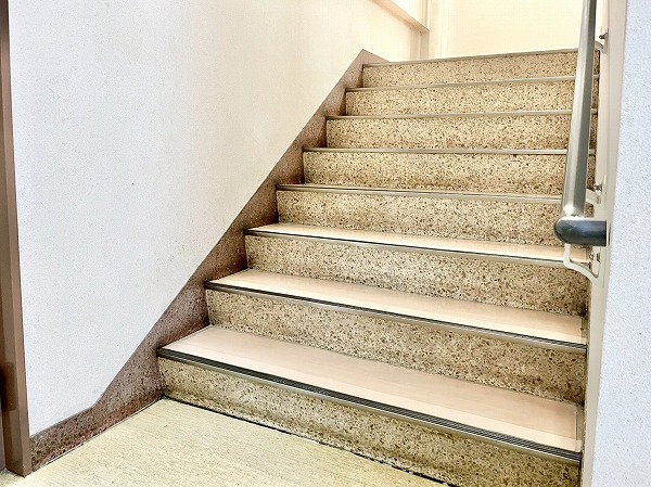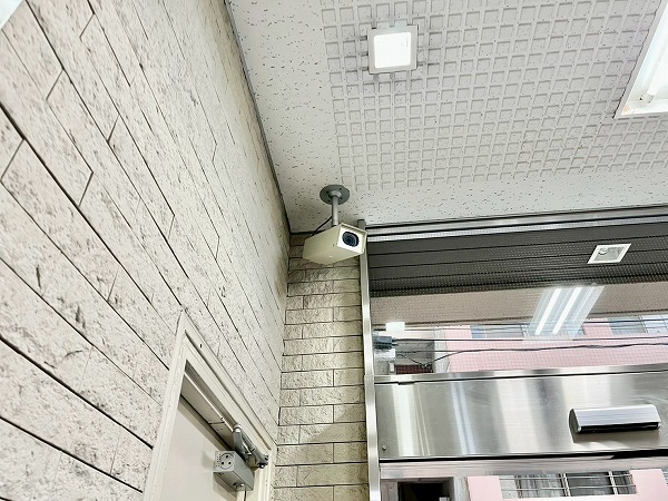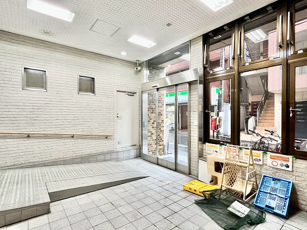 昭和築ならではの、ヴィンテージな魅力あふれるエントランス。荷物の整理に便利なベンチが置かれていました。入り口付近には防犯カメラが設置され、出入りする人をくまなくチェック。